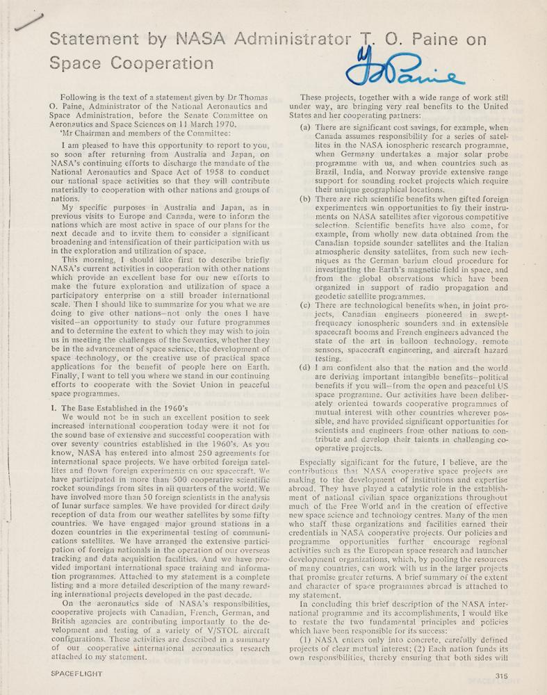 Engineer and NASA administrator (1921-1992) under whose purview the first crewed lunar landing by Apollo 11 was flown, as were three other Apollo missions. Copy of a three-page statement on space cooperation issued by Paine, 8.5 x 11, signed on the first page in blue felt tip, "T. O. Paine." In fine condition, with Paine redoing the first half of his signature due to a faulty first attempt in ballpoint.