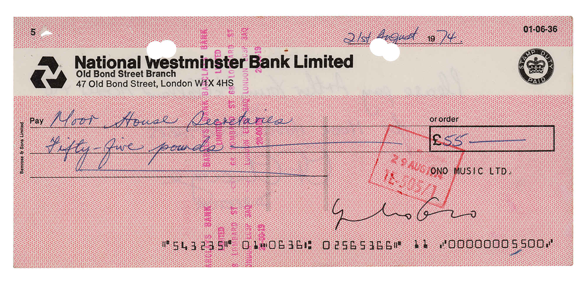 One Music Ltd. business check, 8 x 3.5, filled out in another hand and signed by Yoko Ono, payable to Moor House Secretaries for £55, August 21, 1974. In fine condition.