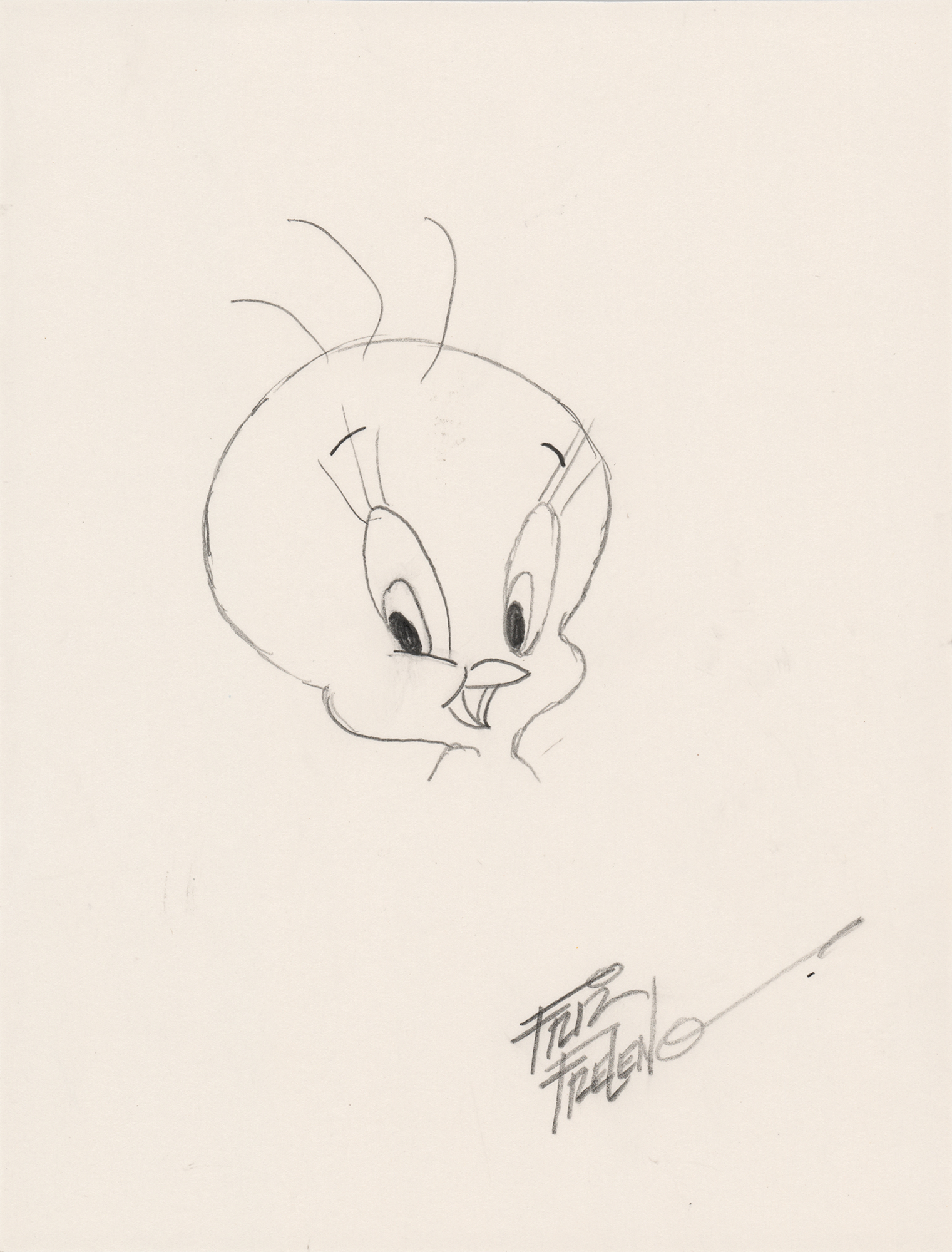 Original sketch of Tweety by Friz Freleng, accomplished in pencil on an off-white 7 x 9.25 cardstock sheet, which is signed below. In very fine condition.