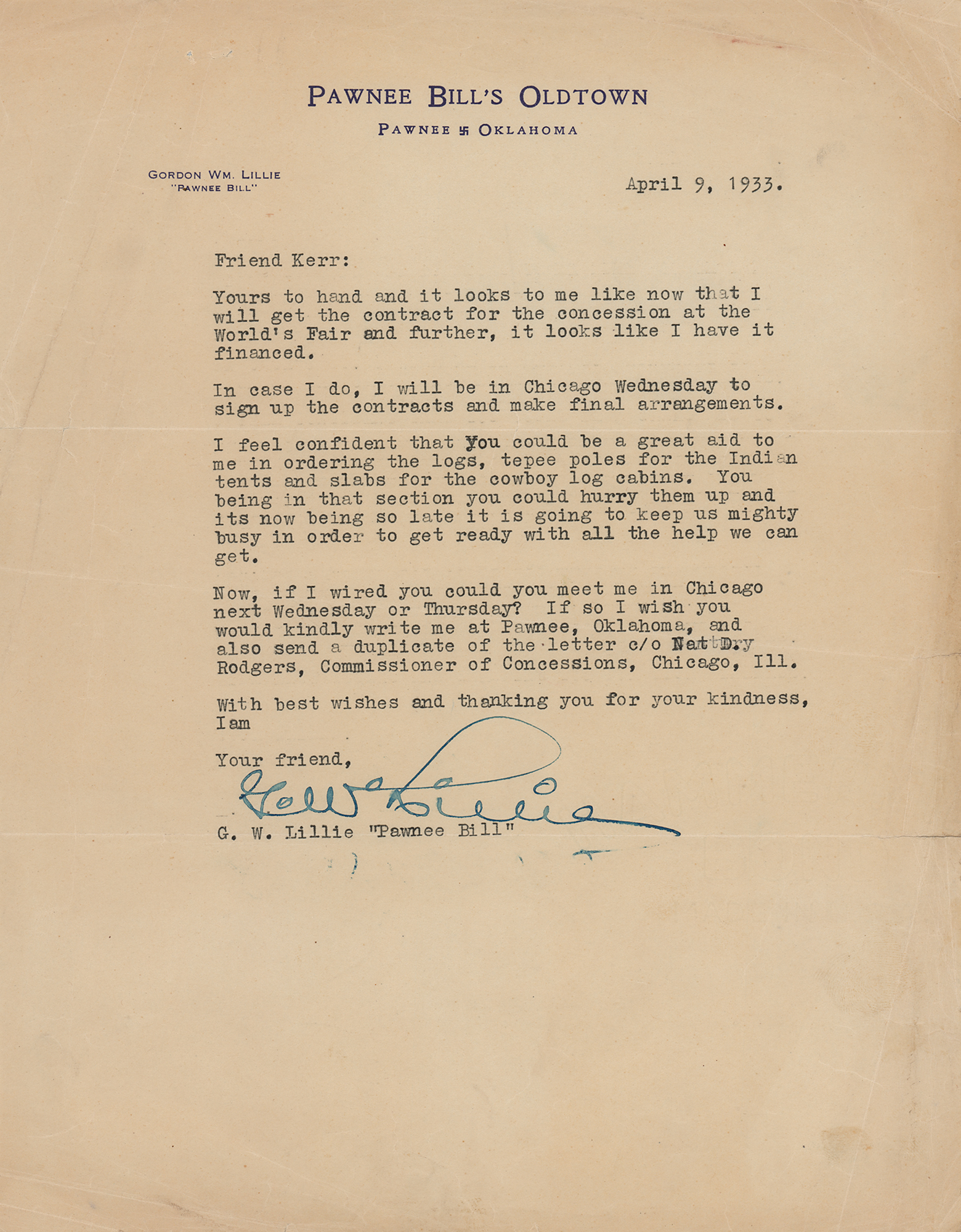 TLS signed “G. W. Lillie,” one page, 8.5 x 11, Pawnee Bill's Oldtown letterhead, April 9, 1933. Letter to “Friend Kerr,” in part: “Yours to hand and it looks to me that I will get the contract for the concession at the World's Fair and further, it looks like I have it financed. In case I do, I will be in Chicago Wednesday to sign up the contracts and make final arrangements. I feel confident that you could be a great aid to me in ordering the logs, tepee poles for the Indian tents and slabs for the cowboy log cabins. You being in that section you could hurry them up and it’s now being so late it is going to keep us mighty busy in order to get ready with all the help we can get.” In very good to fine condition, with staple holes, short edge tears, and creasing in the margins.