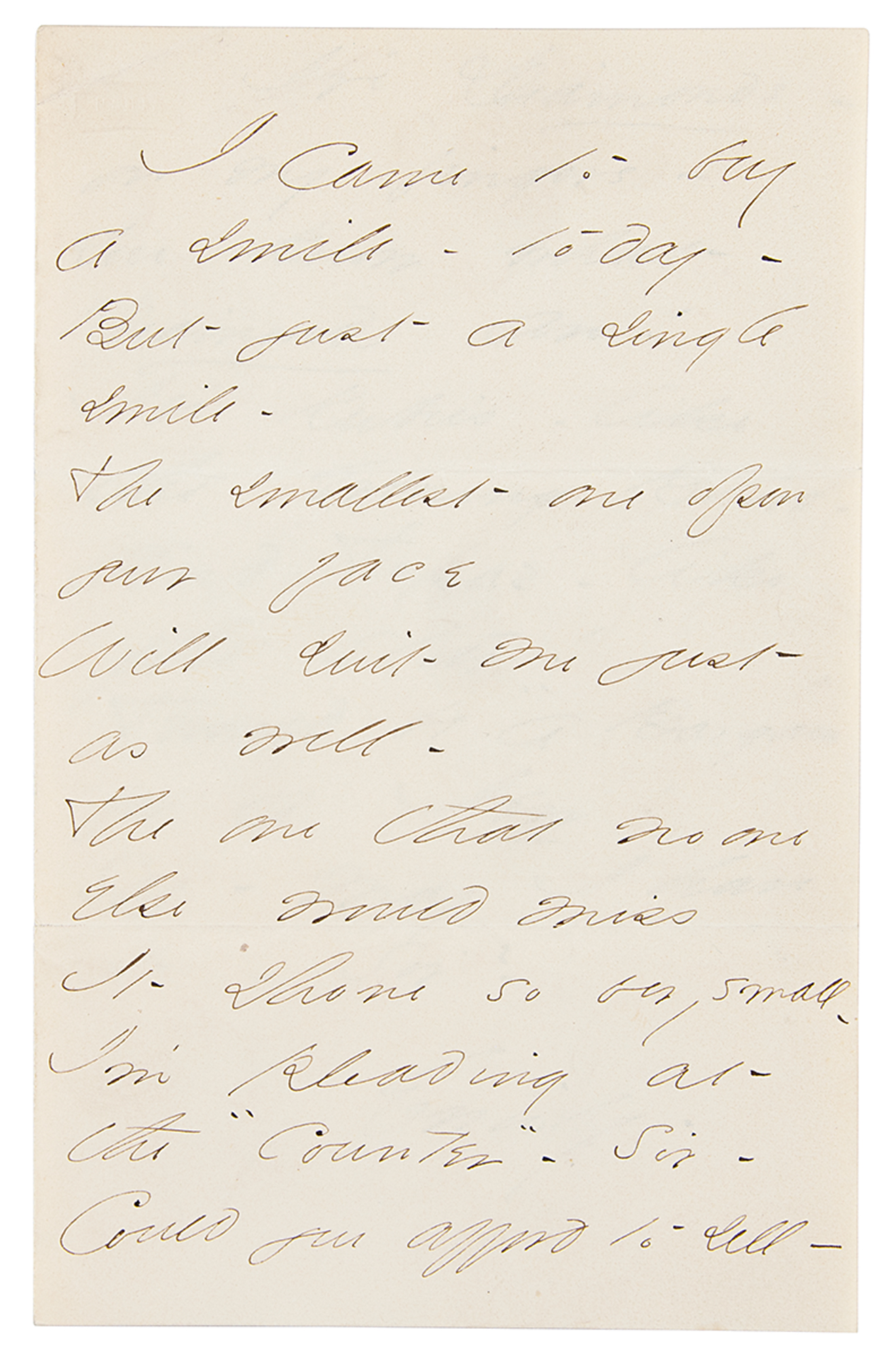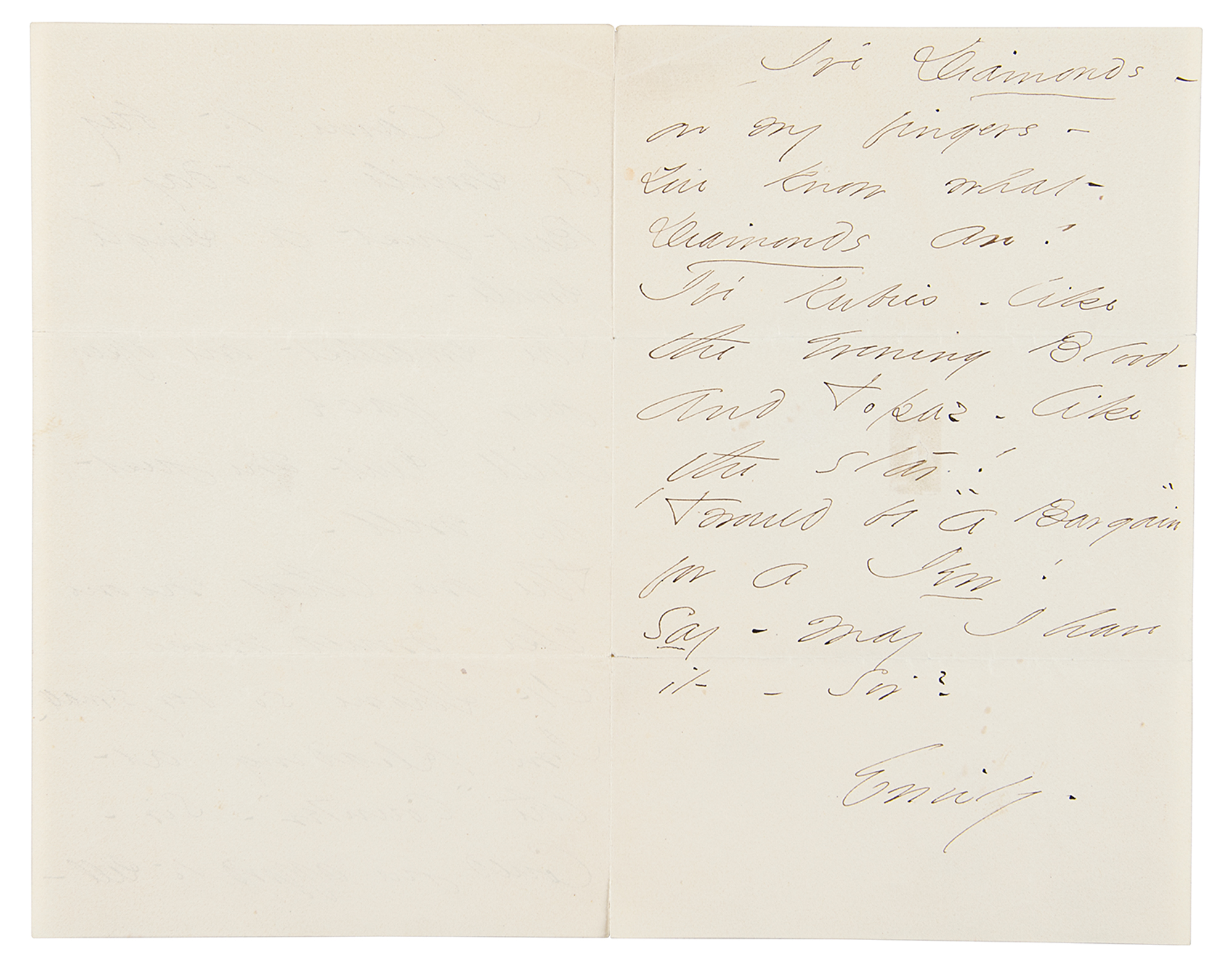 Autograph poem by Emily Dickinson, signed "Emily," two pages on two adjoining sheets, 4 x 6.25, no date but circa 1861. Fabulous autograph manuscript of a poem by Emily Dickinson, rendered in her distinctive, slanted handwriting. In full: