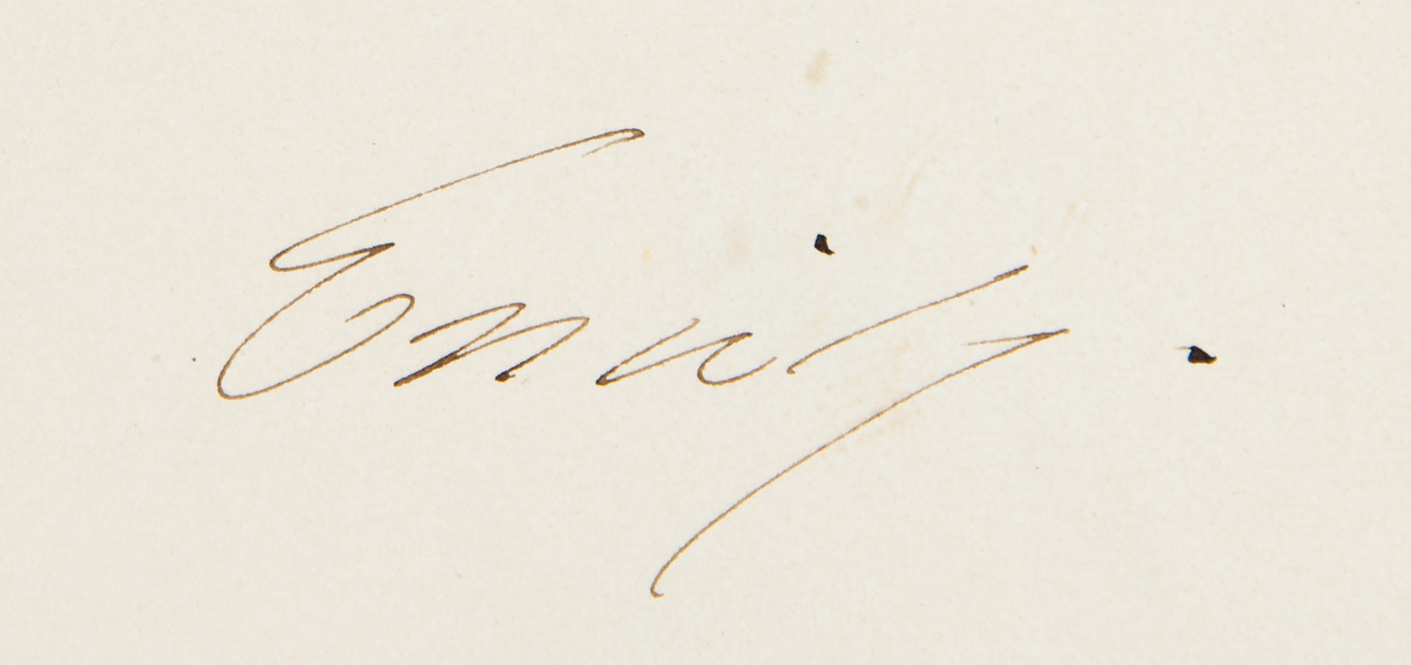 In fine condition, with a small old tape stain to the center of the second page, and partial separation along the hinge. Collected in the 1998 edition of the Franklin Variorum as no. F258A, this is one of two known copies of the autograph manuscript of this lovely Dickinson poem—the other known example is not signed. This one was apparently sent to Samuel Bowles, family friend and journalist who was the owner and editor-in-chief of the Springfield Republican. Any autographic material from Dickinson—a recluse who did not achieve notoriety in her lifetime—is extraordinarily rare, and this is just the second handwritten poem by her that we have ever offered. A true rarity that would be the centerpiece of any American literary collection.