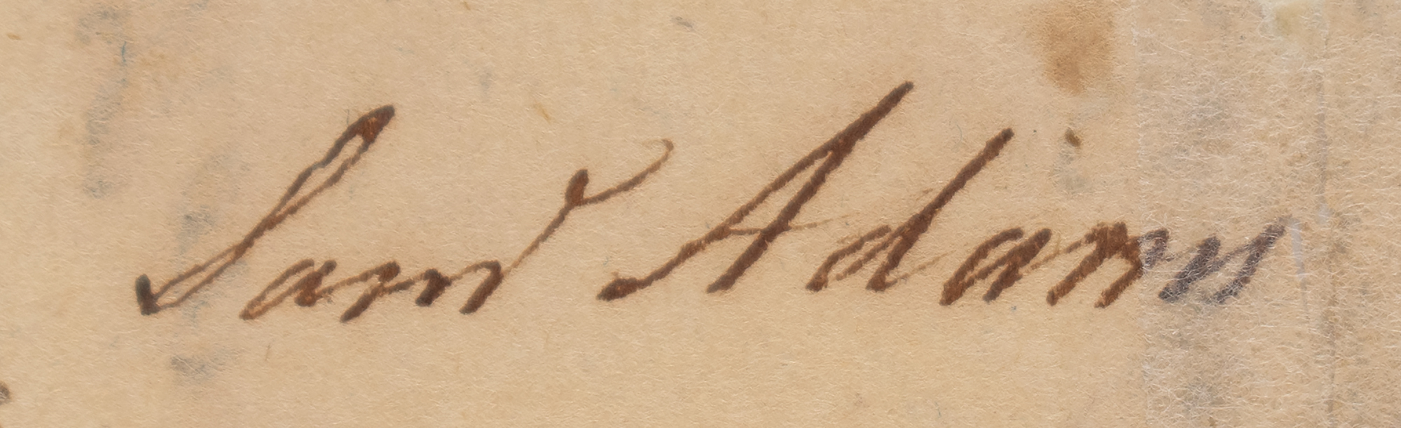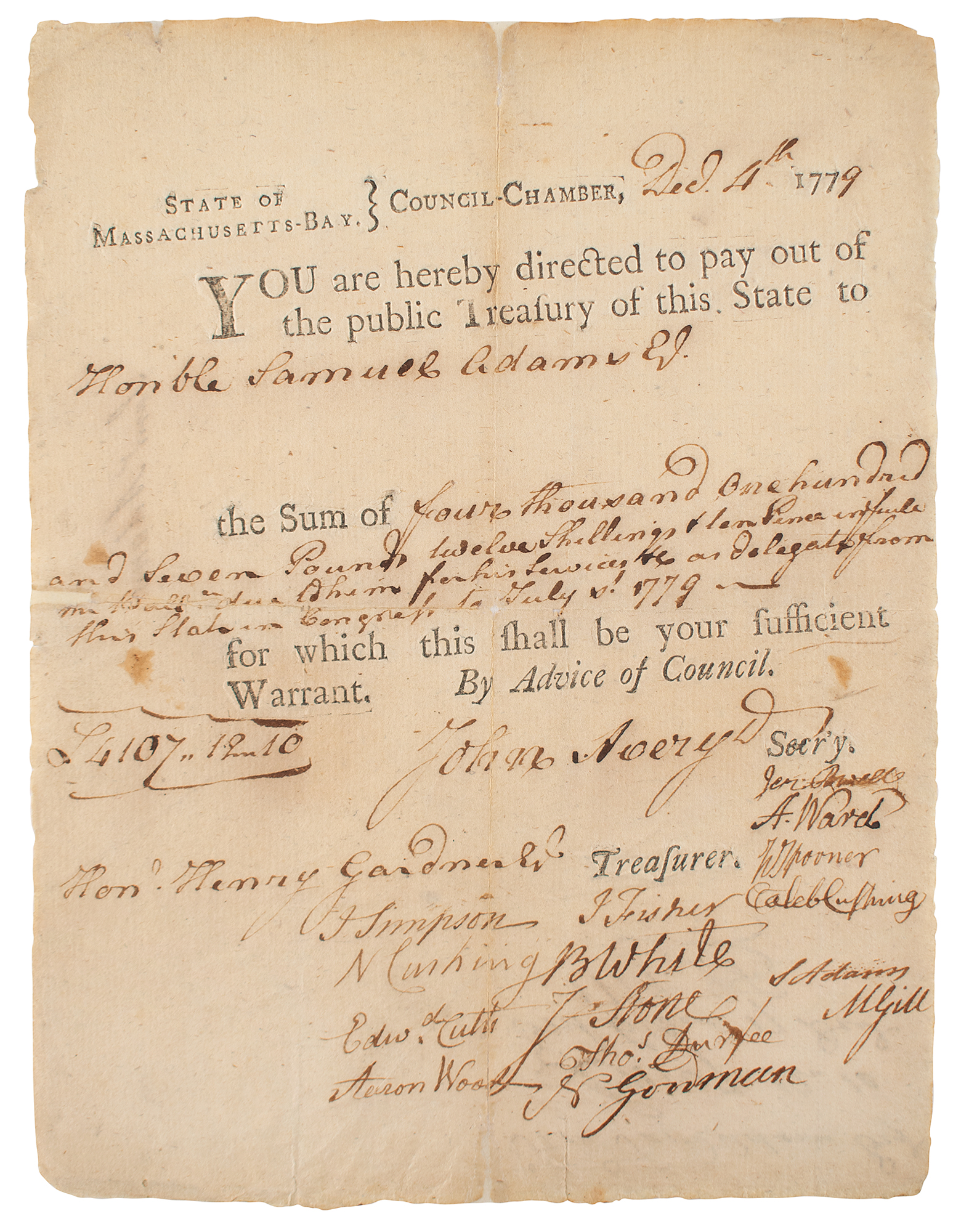 Revolutionary War-dated partly-printed DS, signed “S. Adams” and "Sam'l Adams," one page, 6.25 x 8.25, December 4, 1779. State of Massachusetts-Bay council-chamber warrant ordering Treasurer Henry Gardner to "pay out of the public Treasury of this State to Honble Samuel Adams Esq., the Sum of four thousand one hundred and seven Pounds twelve Shillings & ten pence?for his services &c as a delegate from this State in Congress to July 1st 1779." Signed at the conclusion in ink by John Avery as secretary of the commonwealth, and signed below by fifteen members of the council, including Samuel Adams, Artemas Ward (Major General who was second in command to George Washington), Moses Gill (influential businessman and politician), Nathan Cushing (later a justice of the Massachusetts Supreme Judicial Court), and others. Also endorsed on the reverse by Samuel Adams. In fine condition, with professional repairs to fold splits and small areas of paper loss.