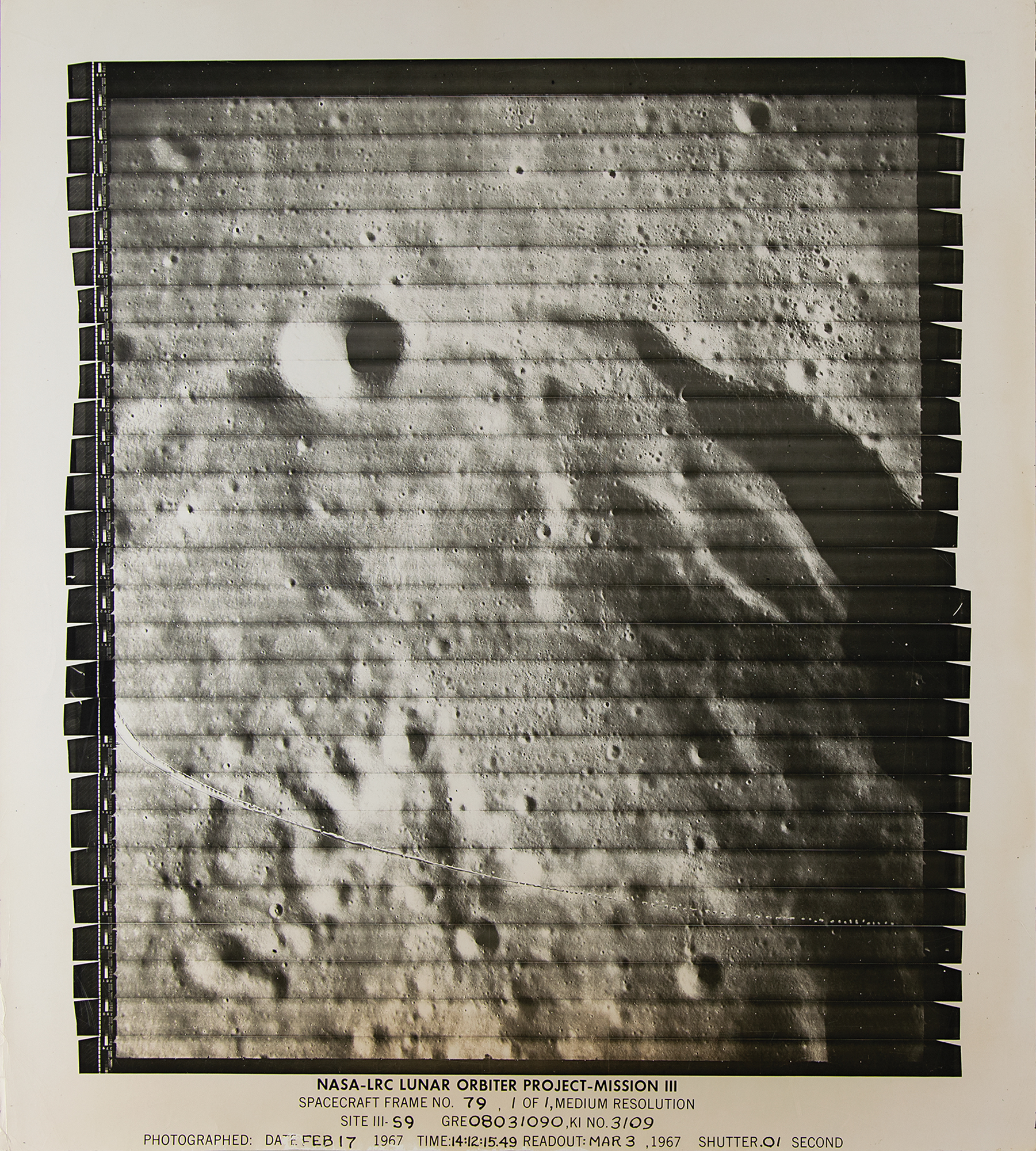 Original vintage glossy 20 x 22.25 silver gelatin photograph featuring imagery of the moon's cratered lunar terrain as taken by the Lunar Orbiter 3, with bottom legend reading: "NASA-LRC Lunar Orbiter Project-Mission III, Spacecraft Frame No. 79, 1 of 1, Medium Resolution, Site III-S9, GRE 08031090, KI NO. 3109, Photographed: Date: Feb 17 1967, Time: 14:12:15.49, Readout: Mar 3, 1967, Shutter .01 Second." In very good to fine condition, with scattered surface creases (mostly to borders), slight edge rippling, and some scuffing along the bottom.