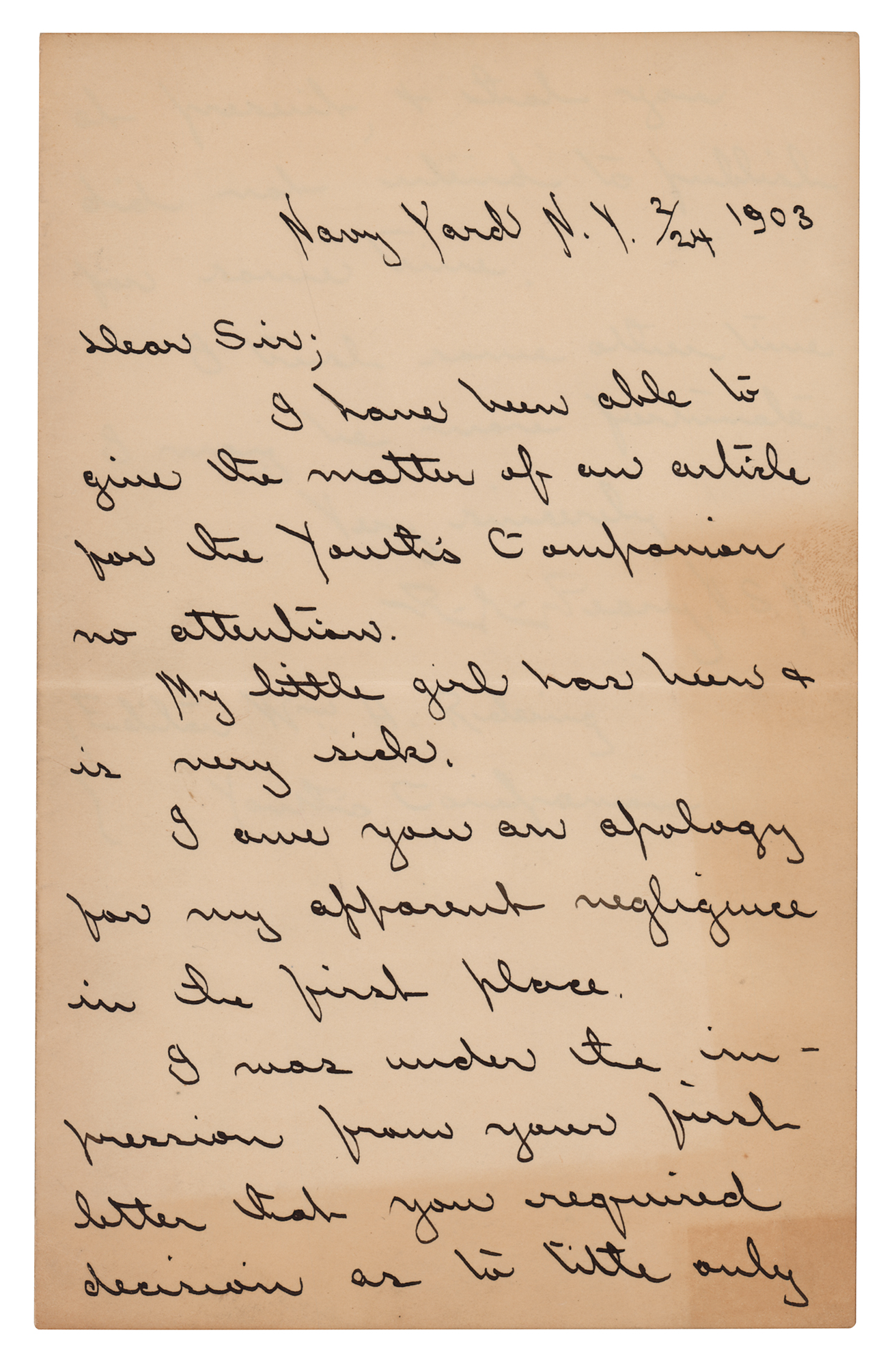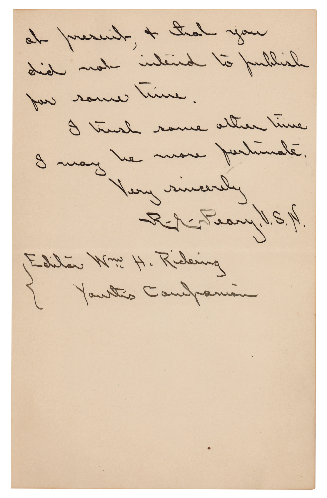 ALS signed “R. E. Peary, U.S.N.,” two pages on two adjoining sheets, 5 x 8, February 24, 1903. Handwritten letter addressed from the New York Navy Yard and sent to William H. Rideing, editor of the Youth's Companion, in full: “I have been able to give the matter of an article for the Youth’s Companion no attention. My little girl has been & is very sick. I owe you an apology for my apparent negligence in the first place. I was under the impression from your first letter that you required decision as to title only at present, & that you did not intend to publish for some time. I trust some other time I may be more fortunate.” In fine condition, with irregular toning to the first page.