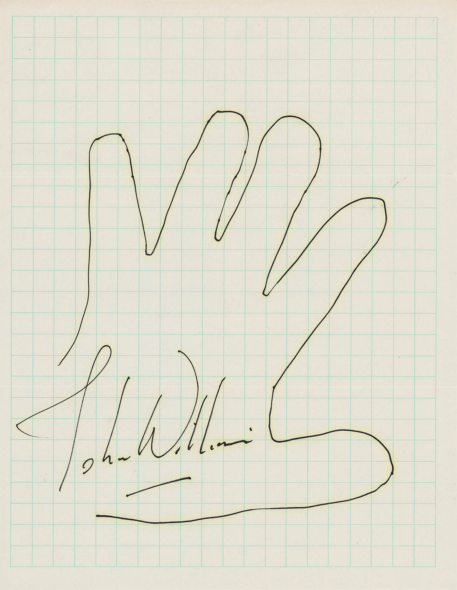 Original traced outline of John Williams’ hand, accomplished by the composer in black felt tip on an 8.5 x 11 sheet of graph paper and signed at the bottom. In fine condition, with mailing folds and faint yellow haloing to the ink.