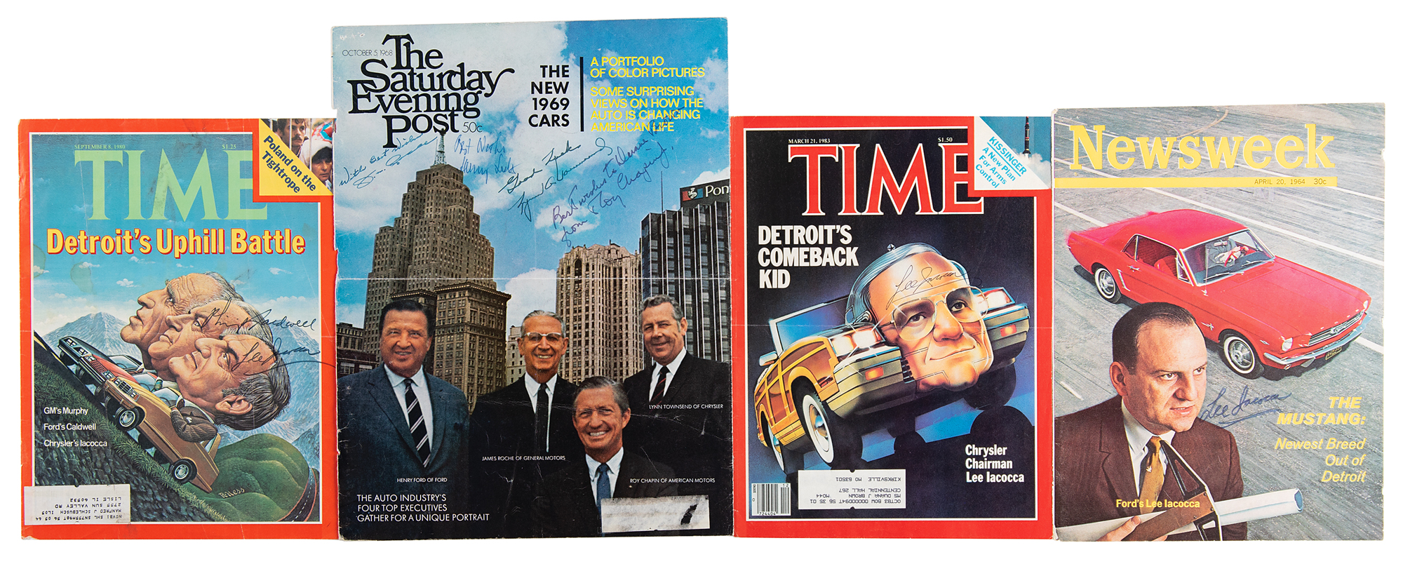 Four magazine front covers from Time, Newsweek, and the Saturday Evening Post, 8.25 x 11 and 10.25 x 13.25, each honoring notable automobile executives, with two signed in felt tip by Lee Iacocca, one signed by Iacocca and Philip Caldwell, and another, the Saturday Evening Post cover, signed by four: Henry Ford III, James Roche, Lynn Townsend, and Roy Chapin. In overall very good to fine condition, with creasing, mailing folds, and a removed mailing label.
