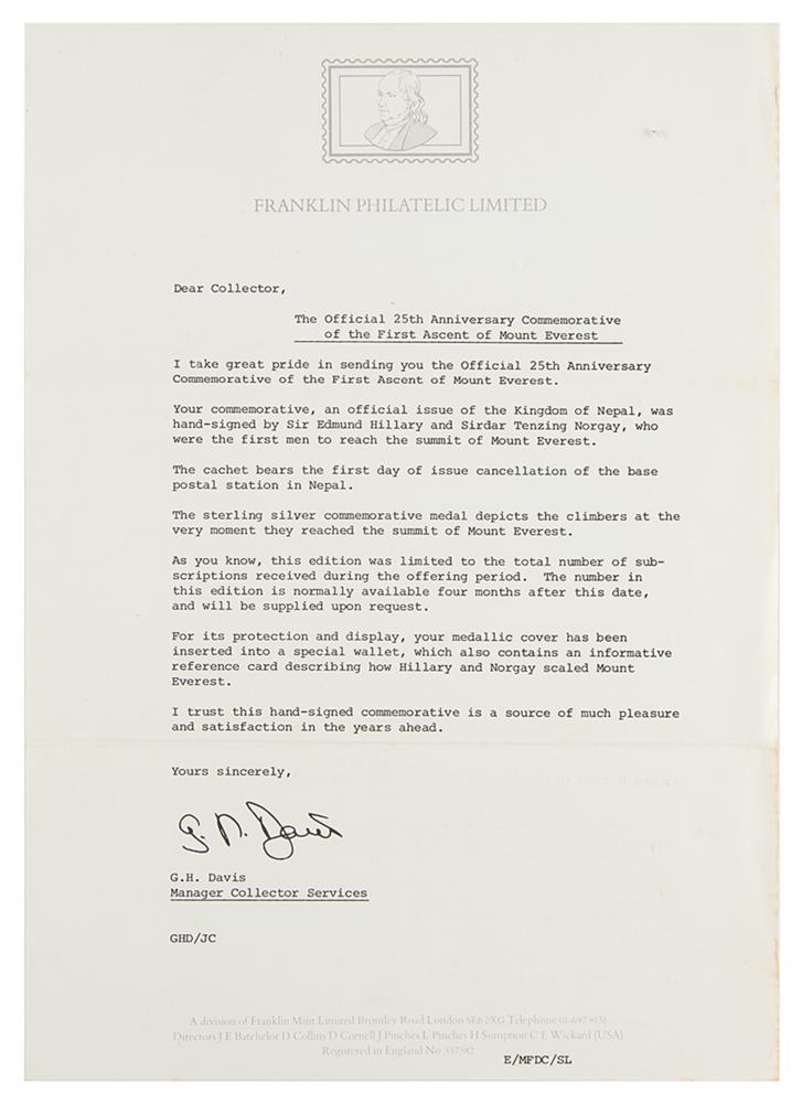 Commemorative cover with a cachet and inlaid medallion honoring the 25th anniversary of the first ascent of Mount Everest, 8 x 4.5, signed in black ballpoint by Edmund Hillary and Tenzing Norgay. Housed in its original presentation folder. In very fine condition. Accompanied by its uncommon letter of authenticity from Franklin Philatelic Limited.