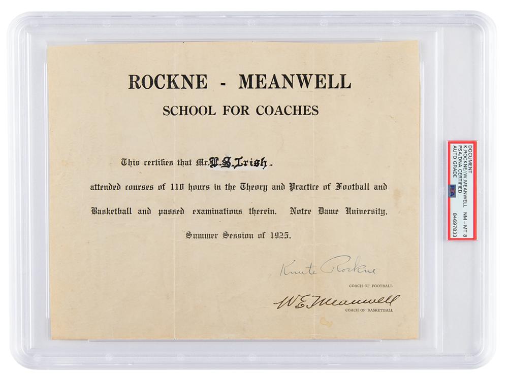 DS, signed "Knute Rockne" and "W. E. Meanwell," one page, 10 x 8, circa the summer of 1925. Certificate from the 'Rockne-Meanwell School for Coaches,' in full: "This certified that Mr. U. S. Irish attended courses of 110 hours in the Theory and Practice of Football and Basketball and passed examinations therein. Notre Dame University, Summer Session of 1925." Signed at the conclusion in ink by both legendary coaches. In very good to fine condition, with light creasing and soiling. Encapsulated and graded by PSA/DNA as "NM-MT 8."