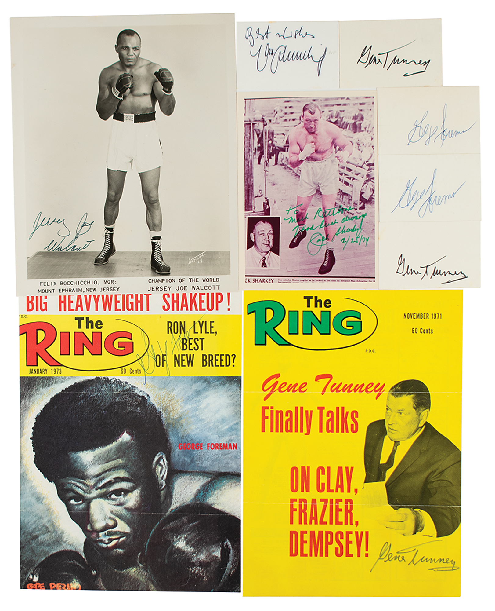 Group lot of nine items signed by a former heavyweight boxing champion, ranging in size from 3.5 x 2.25 card to a 7.75 x 11 magazine page. The boxers include: George Foreman (3: two cards and a magazine cover), Max Schmeling (card), Jack Sharkey (ISP), Gene Tunney (3: two cards and a magazine cover), and Jersey Joe Walcott (SP). In overall fine condition.