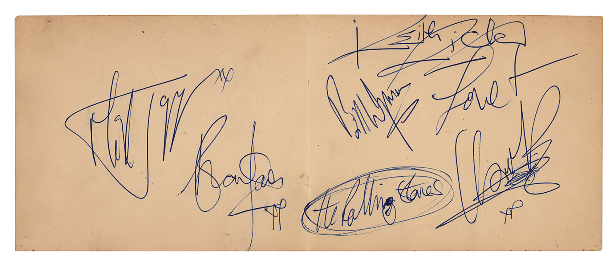 Vintage ballpoint signatures of the Rolling Stones— “Mick Jagger, xx,” “Brian Jones, xx,” “Keith Richard,” Bill Wyman,” and “The Rolling Stones, Charlie Boy, xx”—on an off-white autograph album centerfold page measuring 8.75 x 3.5, the reverse of which has been signed again by Jones and Richards. In fine condition.
