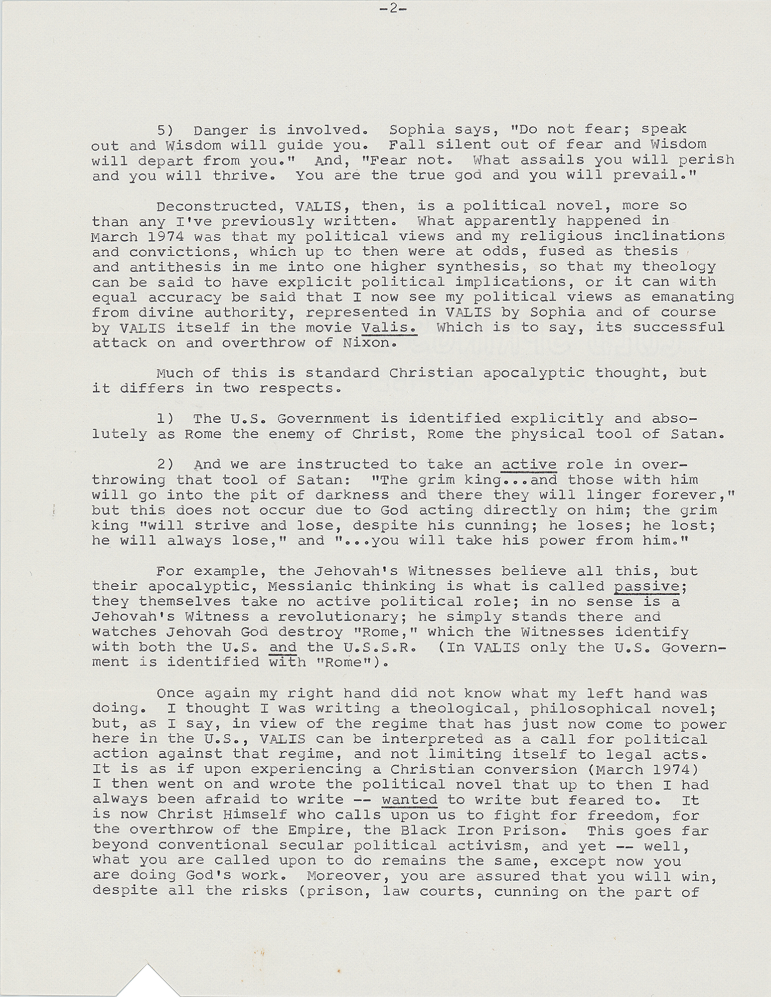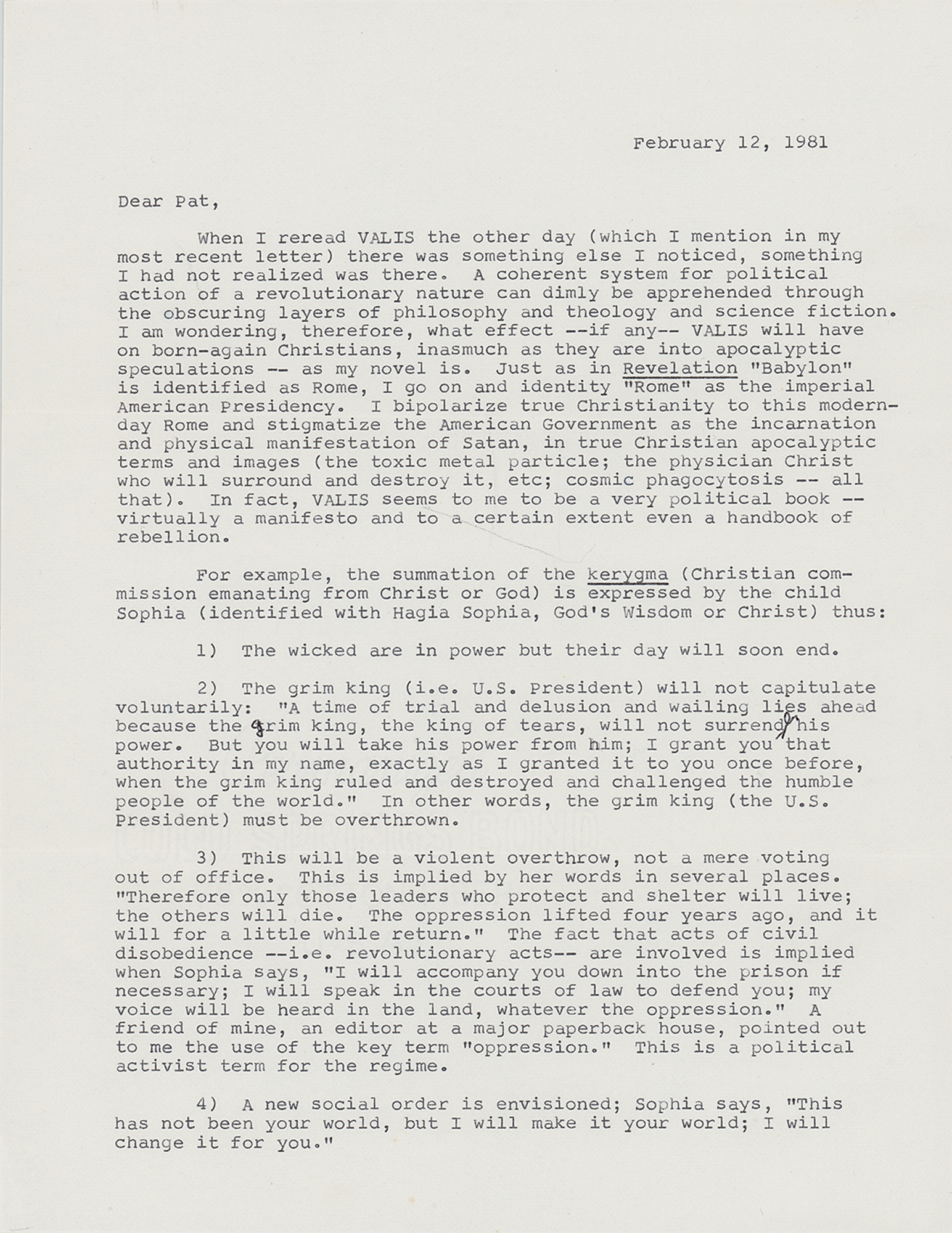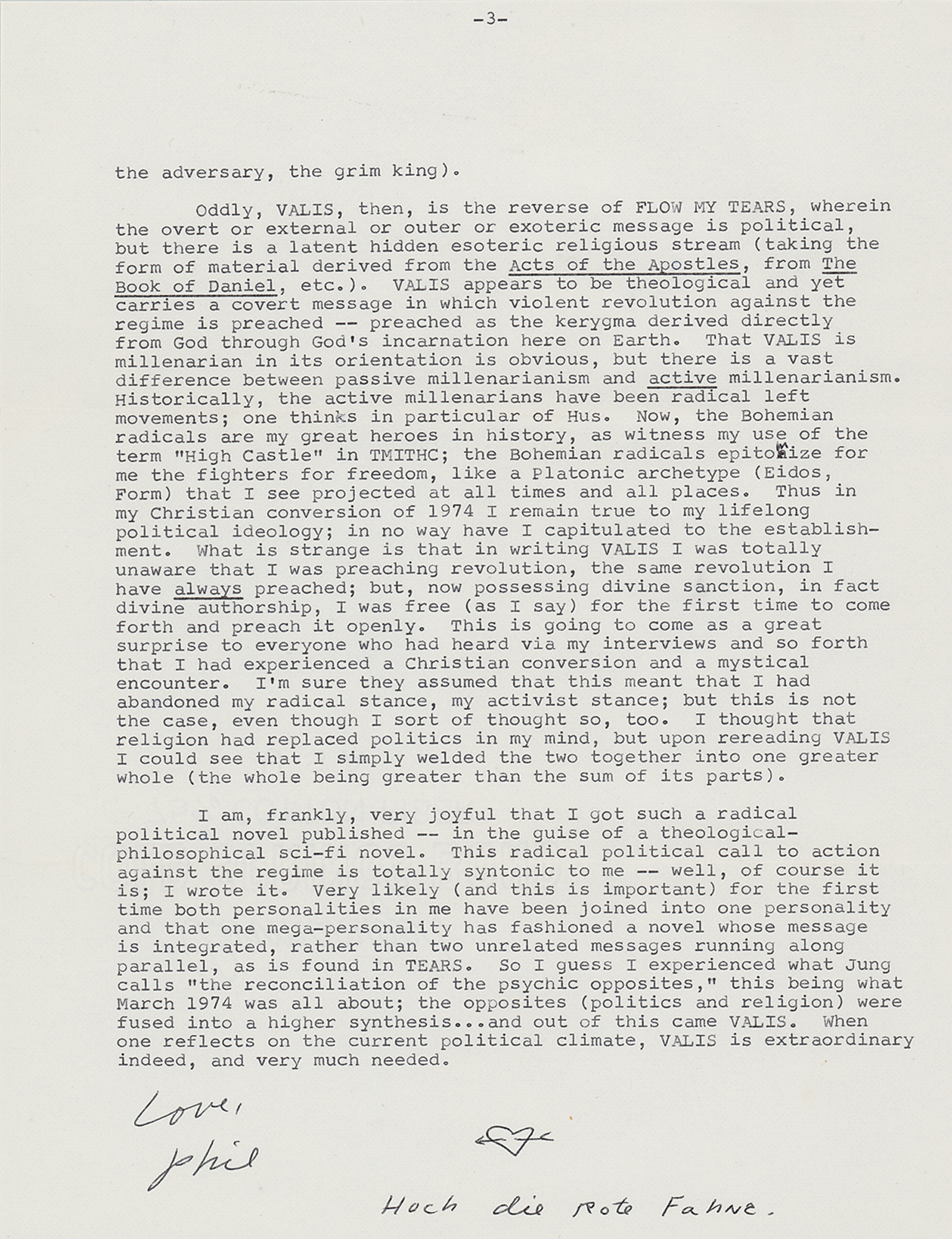 TLS signed “Love, Phil,” who adds a heart with arrow and writes in his own hand, "Hoch die Rote Fahne" [Raise the red flag], three pages, 8.5 x 11, February 12, 1981. Lengthy letter to science fiction author Patricia Warrick, in part: “When I read VALIS the other day (which I mention in my most recent letter) there was something else I noticed, something had not realized was there. A coherent system for political action of a revolutionary nature can dimly be apprehended through the obscuring layers of philosophy and theology and science fiction. I am wondering, therefore, what effect—if any—VALIS will have on born-again Christians, inasmuch as they are into apocalyptic speculations—as my novel is. Just as in Revelation ‘Babylon’ is identified as Rome, I go on and identify ‘Rome’ as the imperial American Presidency. I bipolarize true Christianity to this modern-day Rome and stigmatize the American Government as the incarnation and physical manifestation of Satan, in true Christian apocalyptic terms and images (the toxic metal particle; the physician Christ who will surround and destroy it, etc; cosmic phagocytosis—all that). In fact, VALIS seems to me to be a very political book—virtually a manifesto and to a certain extent even a handbook of rebellion.