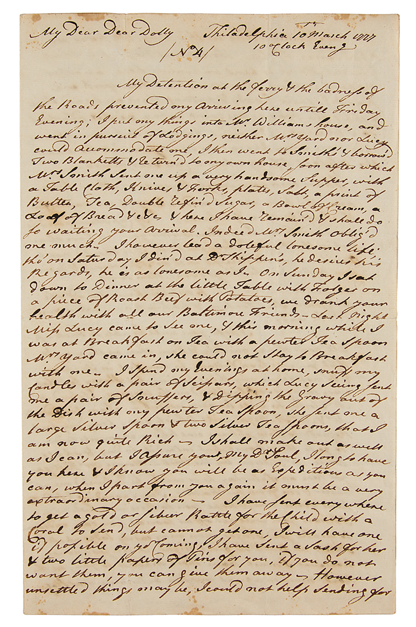 The letter, in full: “My Dear Dear Dolly: My Detention at the Ferry & the badness of the Roads prevented my arriving here untill Friday Evening. I put my things into Mr. Williams' house, and went in pursuit of Lodgings. Neither Mrs. Yard nor Lucy could accommodate me. I then went to Smith's and borrowed two Blankets & returned to my own house; soon after which Mrs. Smith sent me up a very handsome supper, with a Table cloth, Knives & forks, plates, salt, a print of Butter, Tea, double refined Sugar, a Bowl of Cream, a Loaf of Bread &c &c here I have remain'd and shall do so waiting your arrival. Indeed Mrs. Smith oblig'd me much. I however lead a doleful lonesome life. Tho on Saturday I dined at Dr. Shippins. He desires his Regds. he is as lonesome as I. On Saturday I sat down to dinner at the little table with Folger on a piece of Roast Beef with Potatoes. We drank your health with all our Baltimore friends. Last night Miss Lucy came to see me, & this morning while I was at Breakfast on Tea with a pewter tea-spoon, Mrs. Hard came in. She could not stay to Breakfast with me. I spend my evenings at home, snuff my candles with a pair of scissors, which Lucy seeing, sent me a pair of snuffers & dipping gravy out of the Dish with my pewter tea spoon, she sent me a large silver spoon and two silver tea spoons, that I am now quite rich—I shall make out as well as I can, but I assure you, my D’r Soul I long to have you here & I know you will be as expeditious as you can. When I part from you again it must be a very extraordinary occasion—I have sent everywhere to get a gold or silver rattle for the child with a coral to send but cannot get one. I will have one if possible on yr coming. I have sent a sash for her & two little papers of pins for you. If you do not want them you can give them away—However unsettled things may be I could not help sending for you as I cannot live in this way. We have an abundance of lies. The current report is that General Howe is bent on coming here, another report is that the Mercht's at New York are packing their goods & putting them on board ships & that the troops are going away, neither of which do I believe. We must, however, take our chances, this you may depend on, that you will be ever the object of my utmost care & attention—