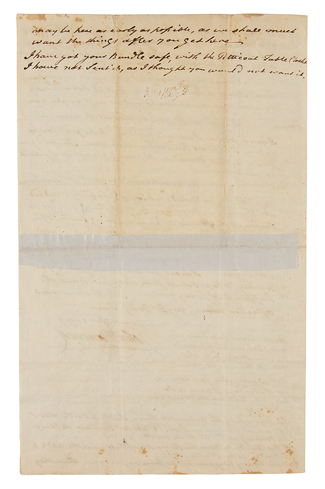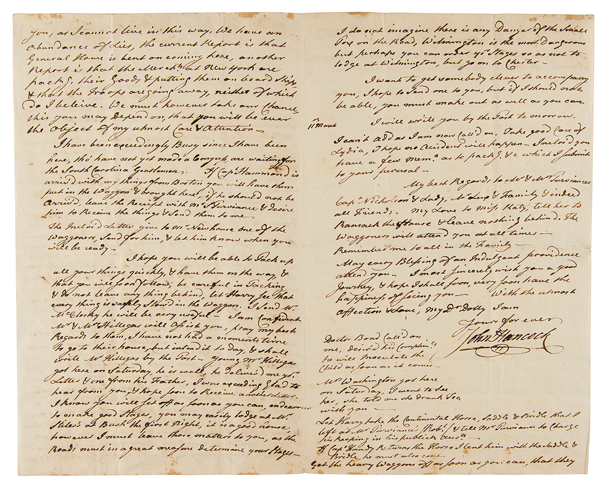 Hancock adds below: “Doctor Bond call'd on me, Desir'd his complements. He will inoculate the child as soon as it comes. Mrs. Washington got here on Saturday. I went to see her. She told me she Drank tea with you—Let Harry take the Continental Horse, Saddle & Bridle, that I left at Mr. Purviance's & tell Mr. Purviance to charge his keeping in his public credit. If Capt Hardy returns the Horse I lent him with the Saddle & Bridle he must also come. Get the heavy waggon off as soon as you can, that they may be here as early as possible as we shall much want the things after you get here. I have got your bundle safe with the Petticoat, Table Cloth, I have not sent it as I thought you would not want it.” In fine condition, with archival tape reinforcement to the central horizontal fold on the back of the last page.