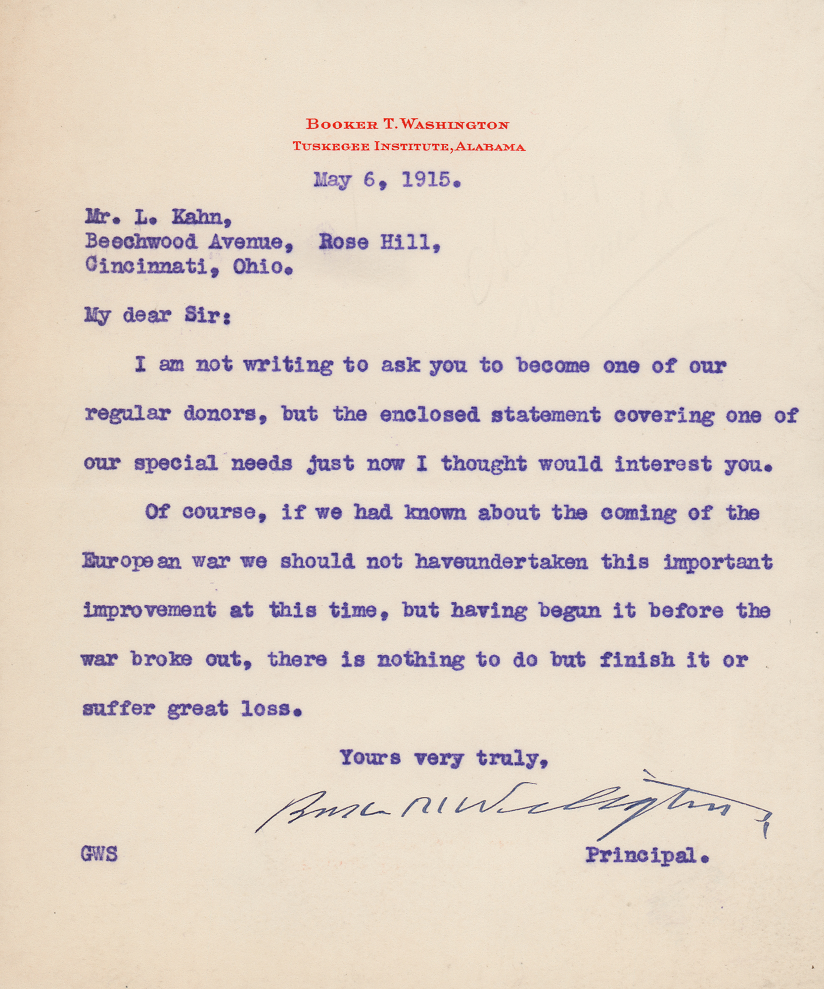 TLS, one page, 5.5 x 6.75, Tuskegee Institute letterhead, May 6, 1915. Letter to L. Kahn of Cincinnati, Ohio, in full: "I am not writing to ask you to become one of our regular donors, but the enclosed statement covering one of our special needs just now I thought would interest you. Of course, if we had known about the coming of the European war we should not have undertaken this important improvement at this time, but having begun it before the war broke out, there is nothing to do but finish it or suffer great loss." In fine condition.