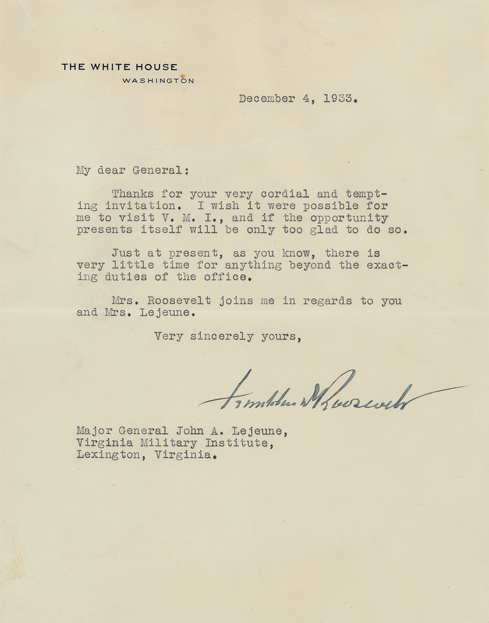 TLS, one page, 7 x 8.75, White House letterhead, December 4, 1933. Letter to Major General John A. Lejeune at the Virginia Military Institute, in part: "Thanks for your very cordial and tempting invitation. I wish it were possible for me to visit V.M.I., and if the opportunity presents itself will be only too glad to do so. Just at present, as you know, there is very little time for anything beyond the exacting duties of the office. Mrs. Roosevelt joins me in regards to you and Mrs. Lejeune." In very good to fine condition, with light rippling, and show-through, at the top from an old clipping affixed to the back. One of the most celebrated Marines of all time, Lejeune became superintendent of the Virginia Military Institute after his retirement from the US Marine Corps.