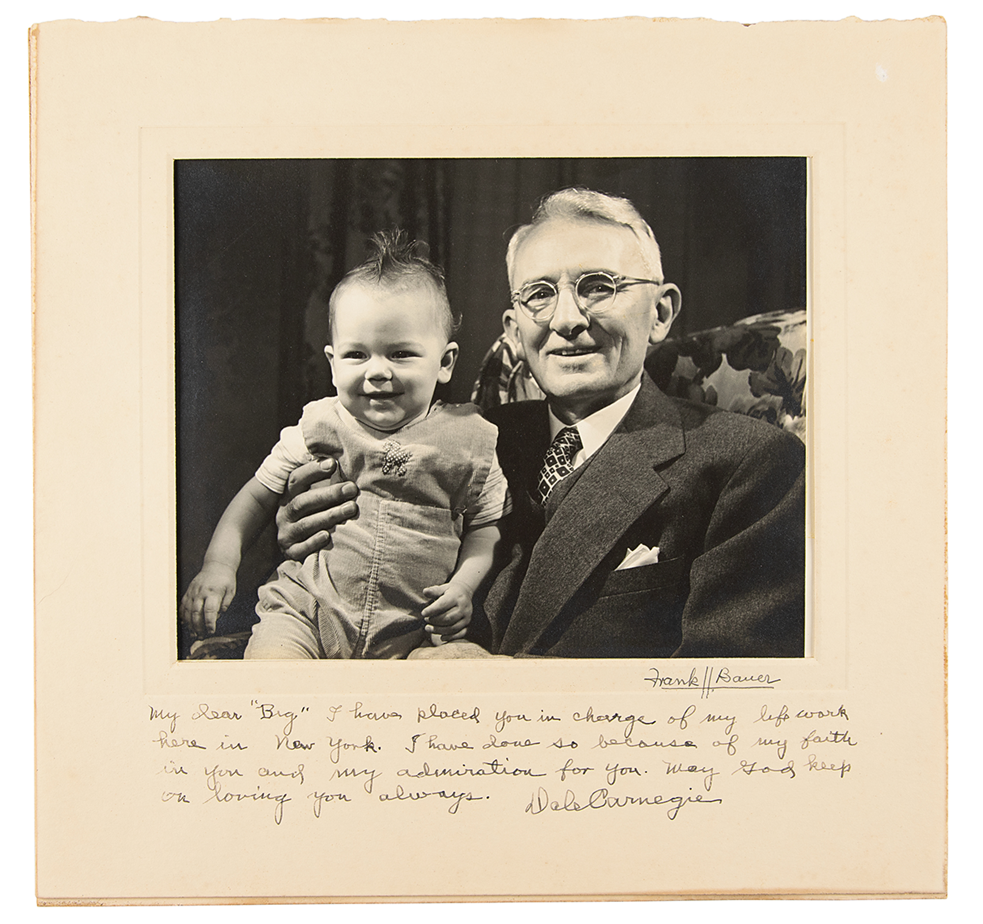 American writer and lecturer (1888-1955) who is best known for his books How to Win Friends and Influence People and How to Stop Worrying and Start Living. Vintage matte-finish 9.25 x 7.25 photo of Carnegie seated and posing with a happy infant, displayed within its original 13.25 x 12.75 studio mat, which is signed and inscribed in fountain pen, "My dear 'Big,' I have placed you in charge of my life work here in New York. I have done so because of my faith in you and my admiration for you. May God keep on loving you always. Dale Carnegie.” The mat is signed by the photography studio in pencil, "Frank // Bauer." Reverse is dated to October 7, 1952. In fine condition, with some light silvering to the perimeter of the image.