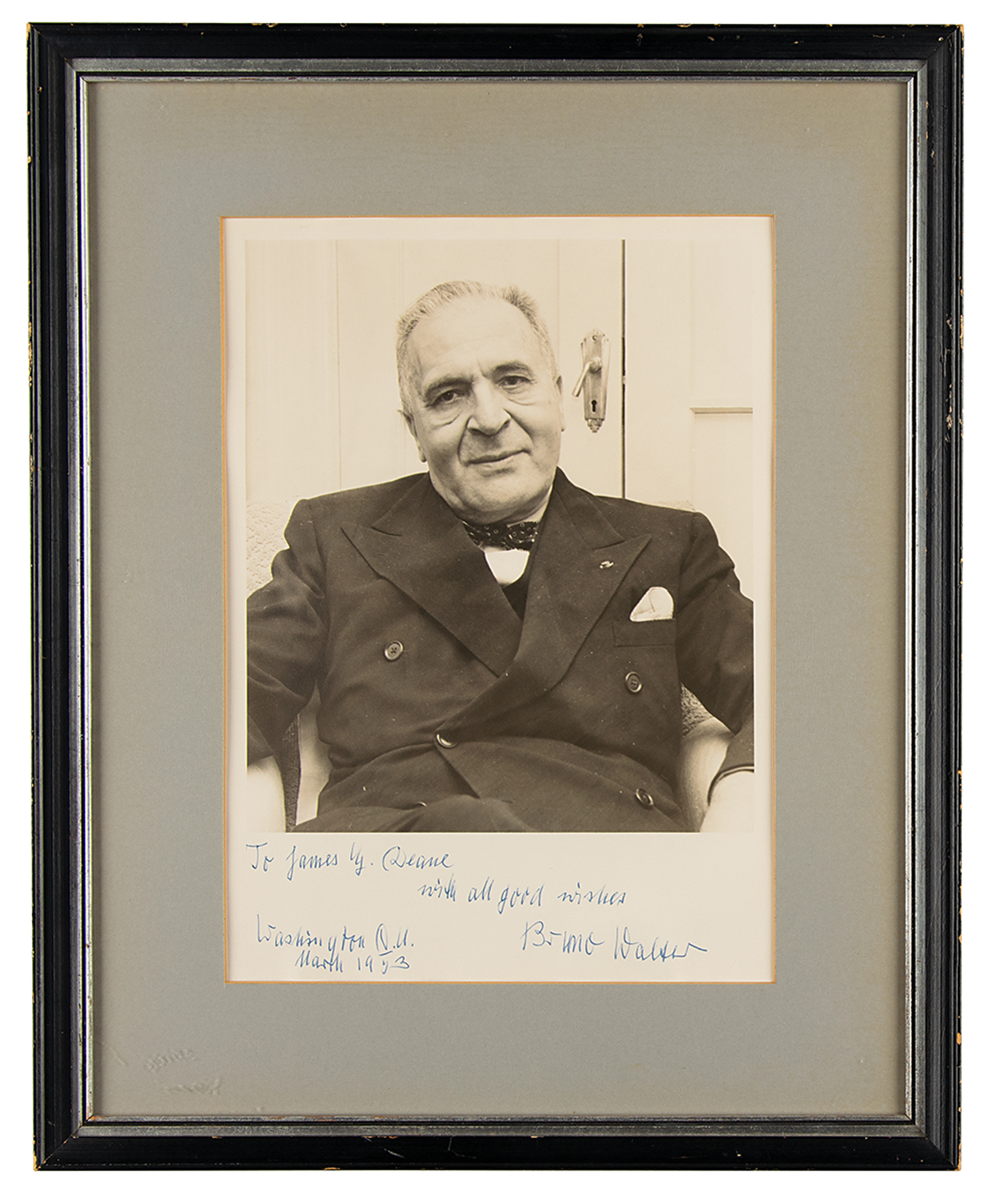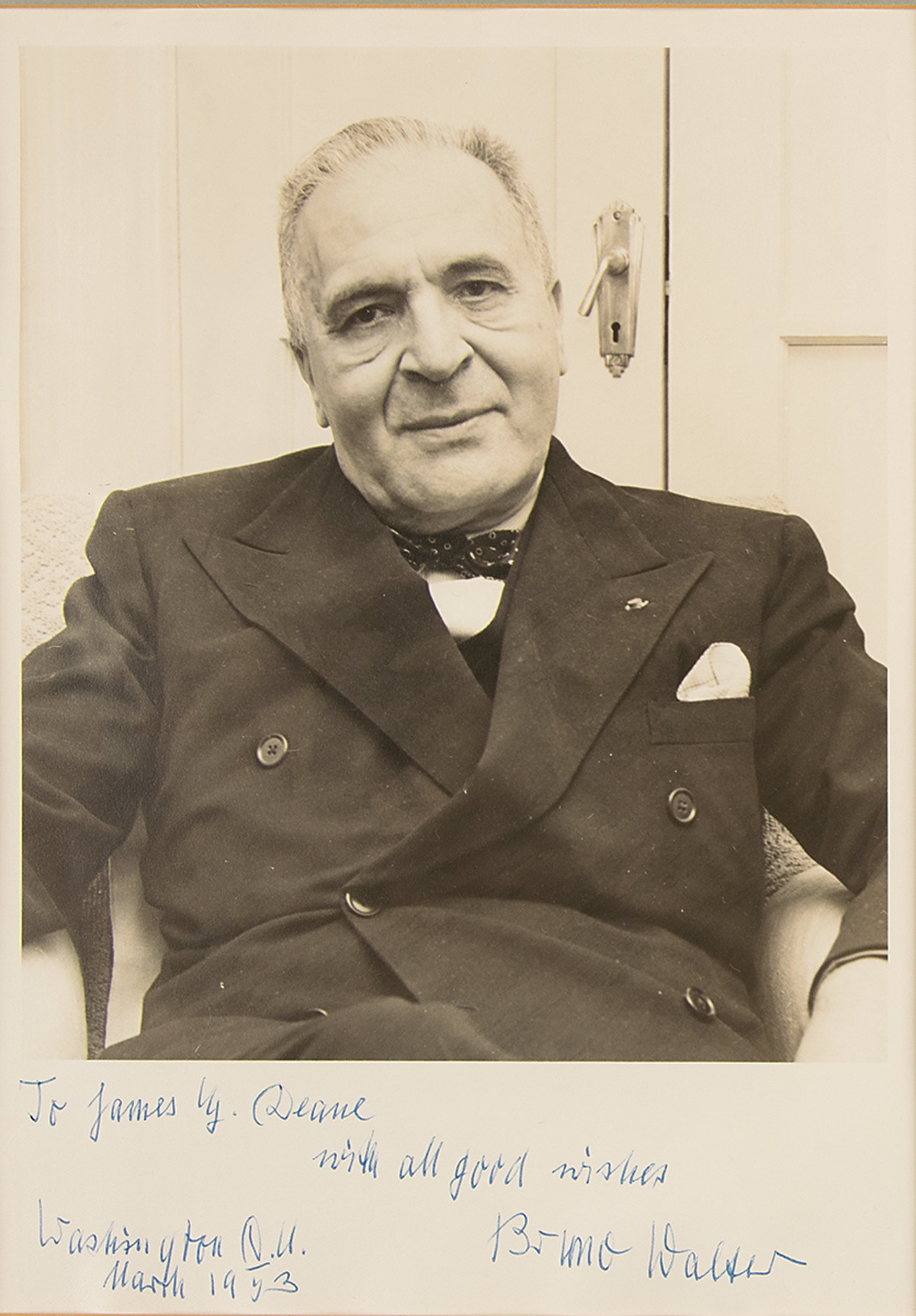 German-born conductor and composer (1876-1962). Vintage matte-finish 8.25 x 11.5 photo of Walter in a front-facing seated pose, signed and inscribed in the lower border in ballpoint, "To James E. Deane, with all good wishes, Bruno Walter, Washington D.C., March 1953.” Matted and framed to an overall size of 14 x 17.5. In fine condition, with some light rippling.