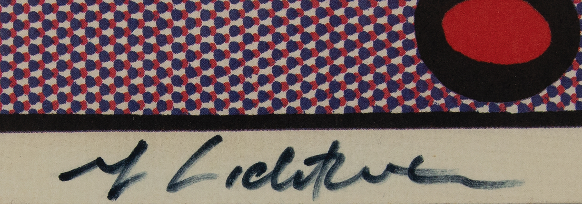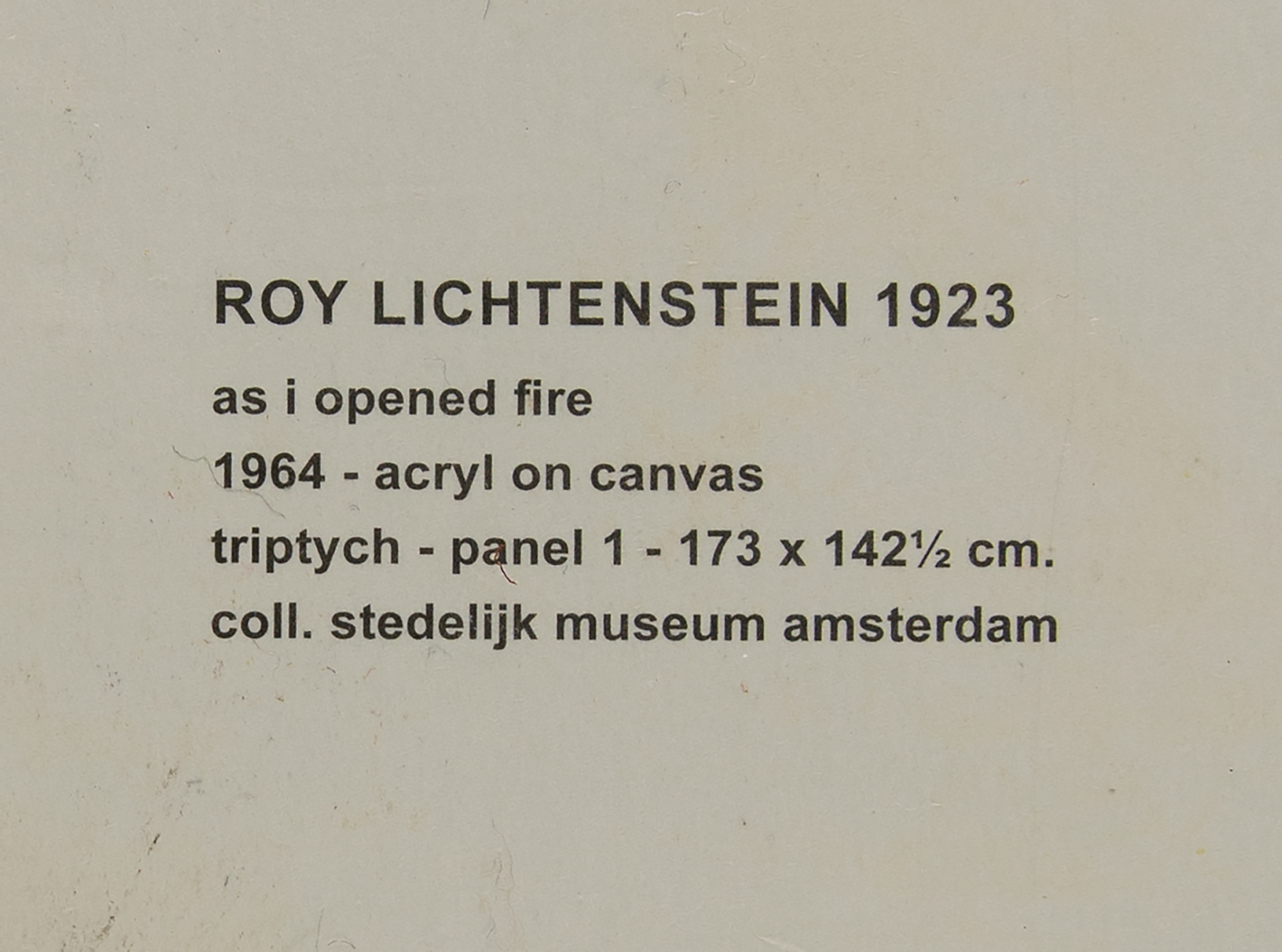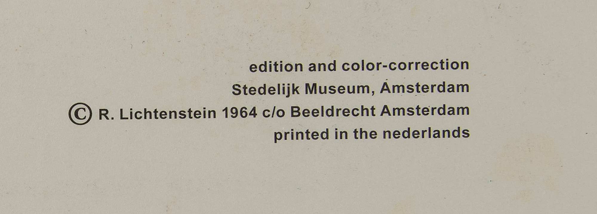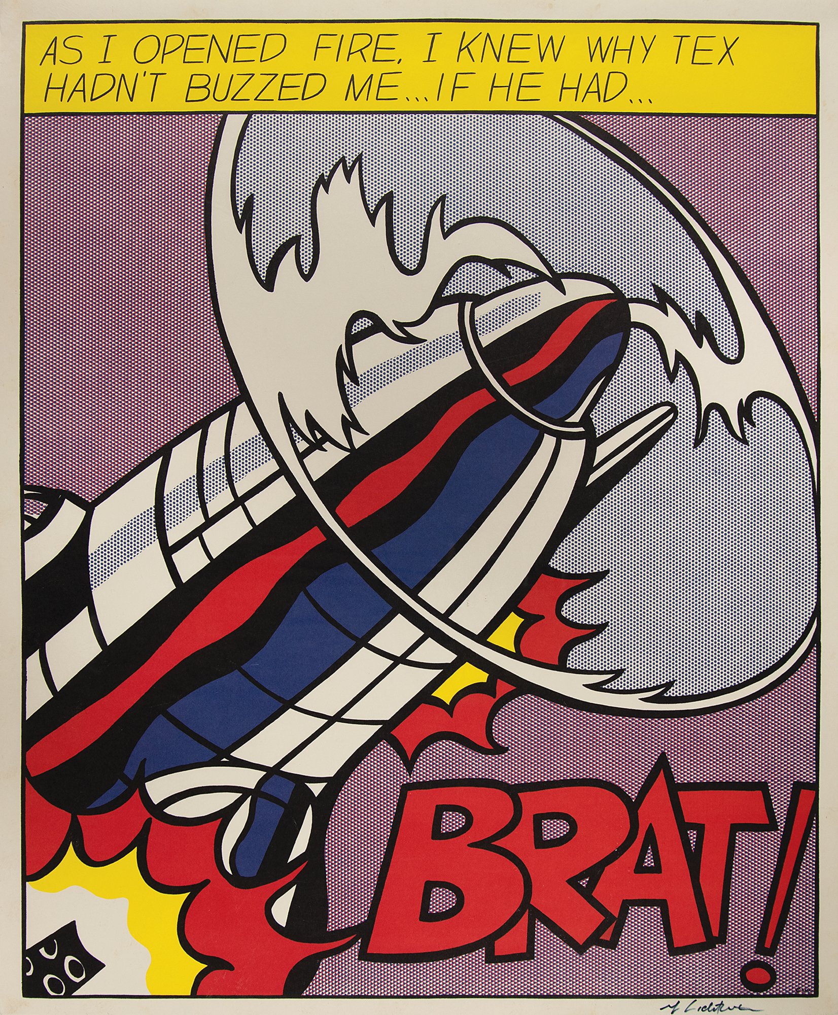 Appealing color 21 x 25.25 poster of Roy Lichtenstein's 1964 work 'As I Opened Fire,' depicting comic strip-style artwork of the whirring propellor of a fighter plane, with large action word below, “BRAT!,” and ‘thought’ text to upper portion, “As I opened fire, I knew why Tex hadn’t buzzed me?if he had?” Signed in the lower border in black felt tip by the artist. Printed by the Stedelijk Museum in Amsterdam, Netherlands. Rolled and in fine condition.