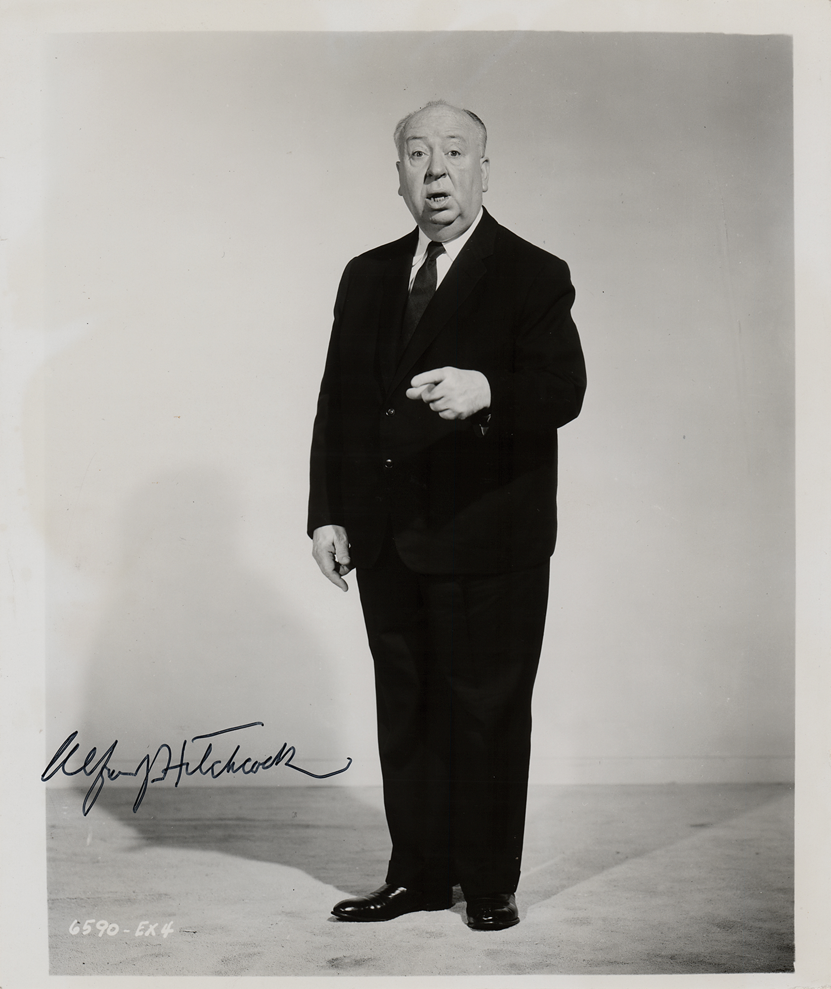 Glossy 8 x 9.5 full-length photo of the great director with a quizzical, perhaps surprised, expression, signed in black felt tip by Alfred Hitchcock. In fine condition.