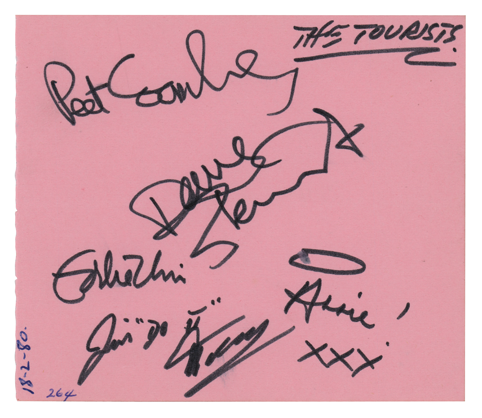 Black felt tip signatures of The Tourists—Peet Combes, Dave Stewart, Eddie Chin, Jim Toomey, and Annie Lennox, who adds a halo over her name and “xxx” below. The page is dated to February 18, 1980, indicating that the autographs were obtained when The Tourists performed at Sheffield City Hall on February 18, 1980. In very fine condition. Accompanied by a certificate of authenticity from Tracks.