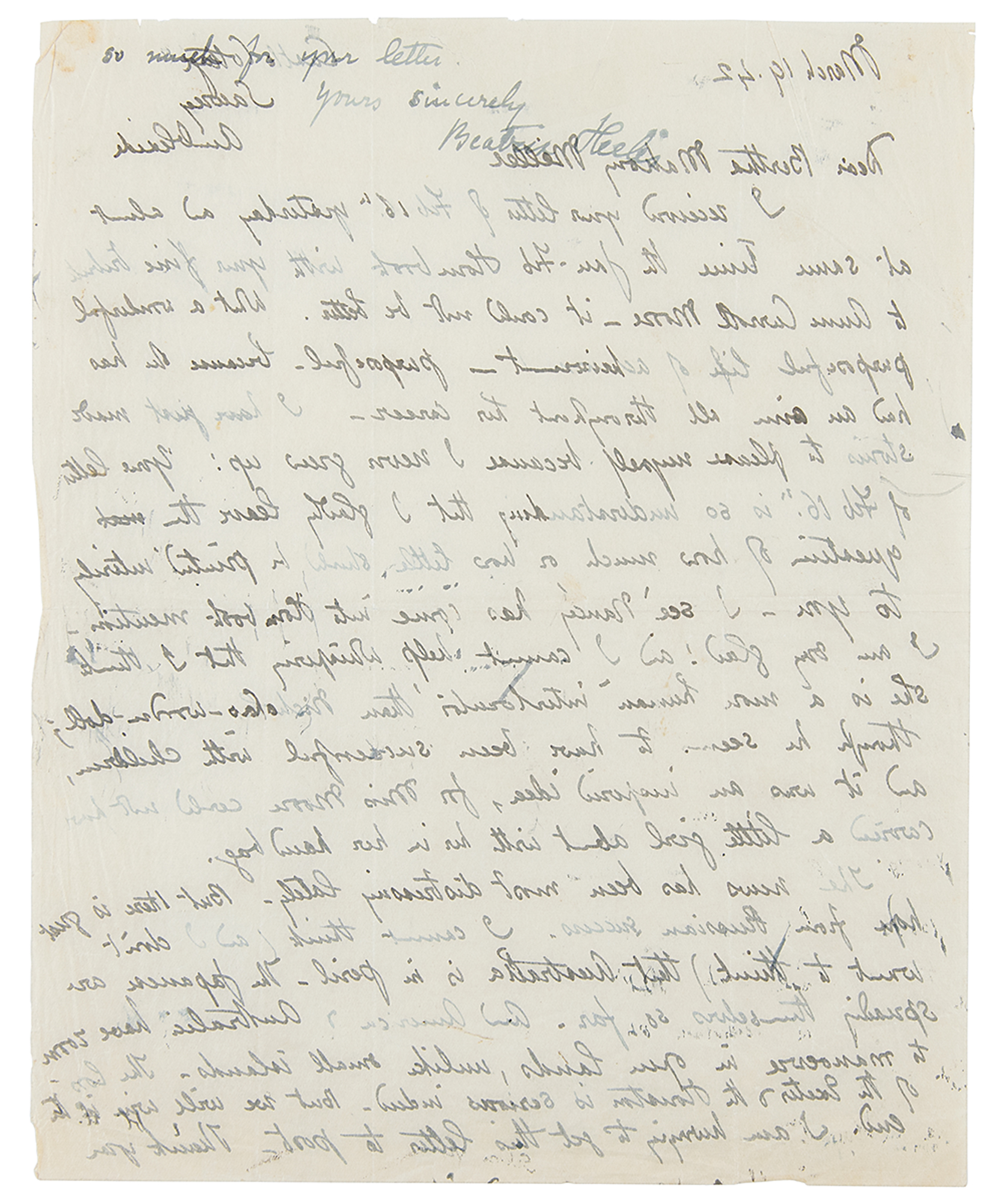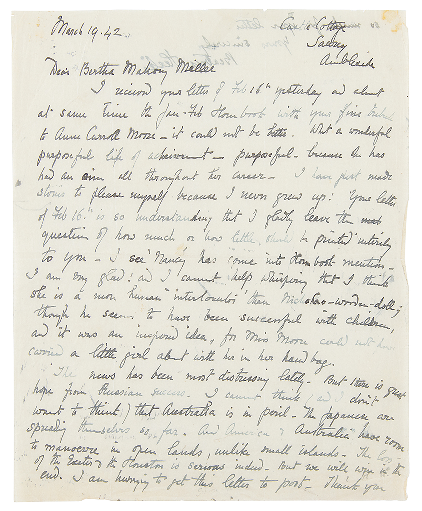 British author and illustrator (1866–1943) whose Edwardian-era tales of naughty rabbits, bad mice, and other amusingly mischievous animals take a place among the most enduring and beloved works in the annals of children's literature. Her first and best-known book, The Tale of Peter Rabbit, has sold more than 40 million copies since it was first published in 1902. ALS signed “Beatrix Heelis,” one page both sides, 7.75 x 9.75, March 19, 1942. Handwritten letter to Bertha Mahony Miller, a figurehead of the children's literature movement who established one of the first children's bookstores and founded The Horn Book Magazine. In part: "I received your letter…and about at same time the Jan-Feb Hornbook with your fine tribute to Anne Carroll Moore—it could not be better. What a wonderful purposeful life of achievement—purposeful, because she has had an aim all throughout her career. I have just made stories to please myself because I never grew up! Your letter…is so understanding that I gladly leave the question of how much or how little should be printed entirely to you. I see 'Nancy' has come into Hornbook mention. I am very glad! And I cannot help whispering that I think she is a more human 'interlocutor' than Nicholas-wooden-doll [referring to Moore's award-winning 1924 book Nicholas: A Manhattan Christmas Story]; though he seems to have been successful with children, and it was an inspired idea, for Miss Moore could not have carried a little girl about with her in her handbag. The news has been most distressing lately. But there is great hope from Russian success. I cannot think (and I don't want to think) that Australia is in peril. The Japanese are spreading themselves so far. And America & Australia have room to manoeuvre in open lands, unlike small islands. The loss of the Exeter & the Houston is serious indeed. But we will win in the end." In fine condition.