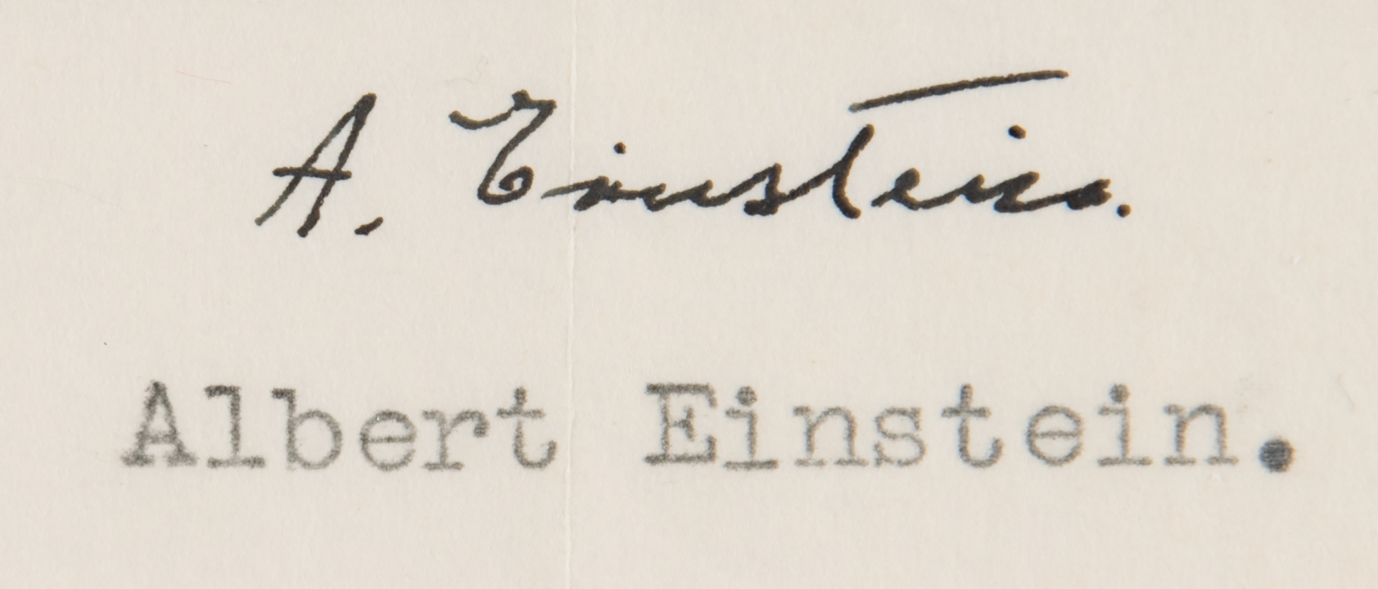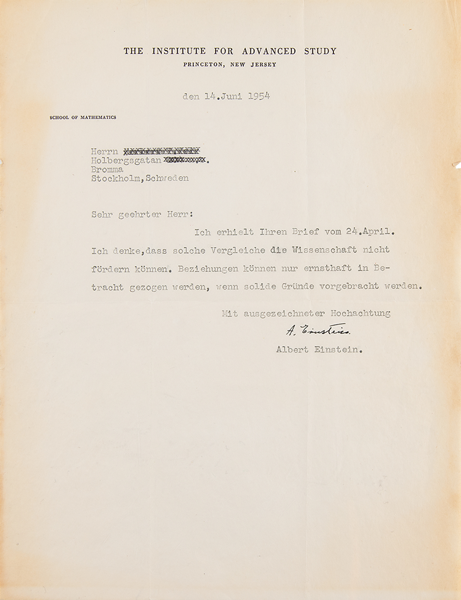 TLS in German, signed “A. Einstein,” one page, 8.5 x 11, The Institute for Advanced Study letterhead, June 14, 1954. Interesting letter to a gentleman in Stockholm, Sweden, in full (translated): "I received your letter of April 24th. I think that such comparisons cannot challenge science. Relationships can only be seriously considered when solid reasons are presented." Includes the original mailing envelope, noting Einstein's office in "Room 115" at the Institute. In fine condition, with light toning long the side edges and the recipient's name obliterated on both the letter and envelope. An intriguing, boldly signed letter by the celebrated physicist.