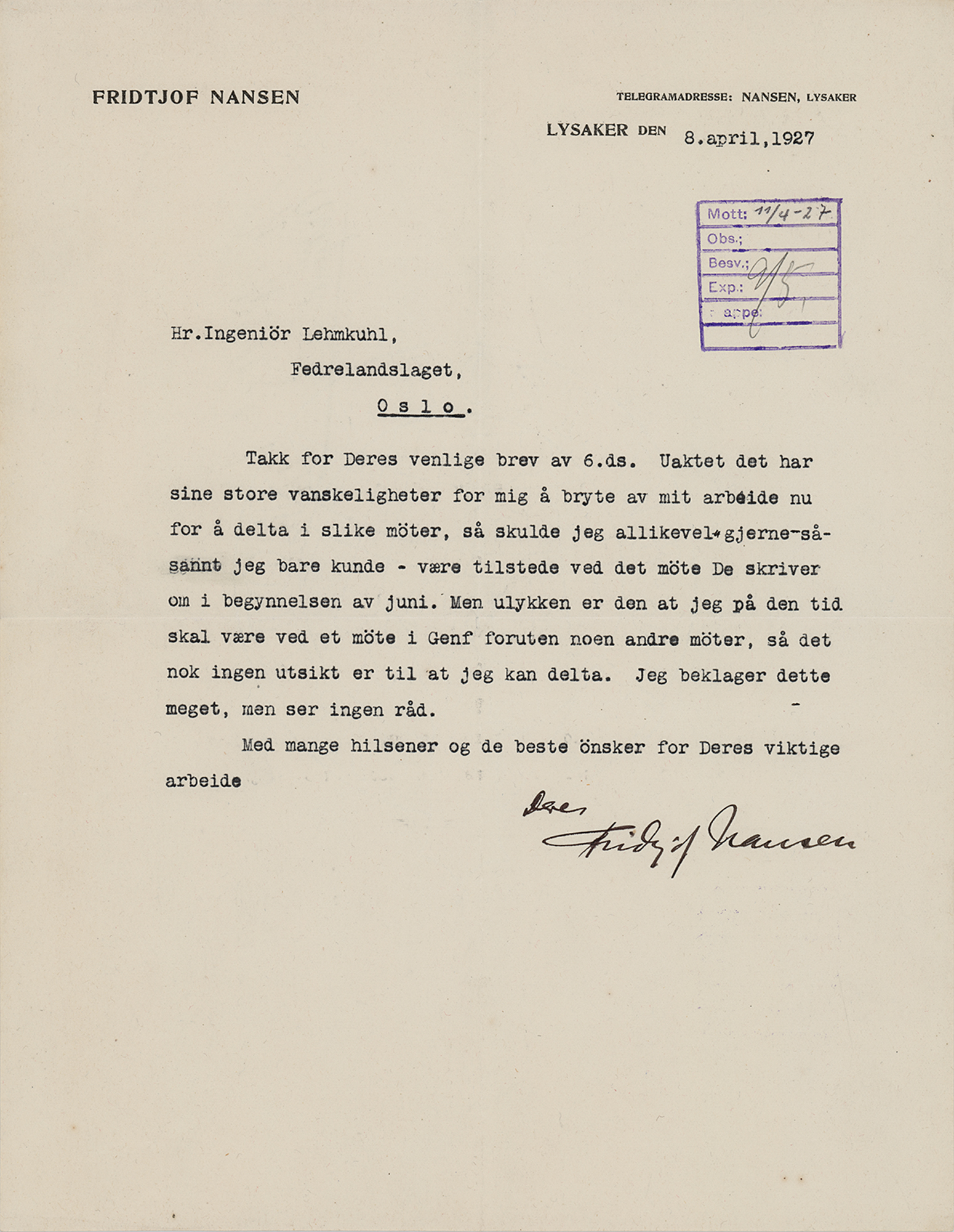 Norwegian explorer, scientist, diplomat, humanitarian, and Nobel laureate (1861-1930) who led the first crossing of the Greenland interior in 1888. TLS in Norwegian, one page, 8.75 x 11.25, personal letterhead, April 6, 1927. Untranslated letter to an engineer, boldly signed at the conclusion by Fridtjof Nansen. In fine condition.