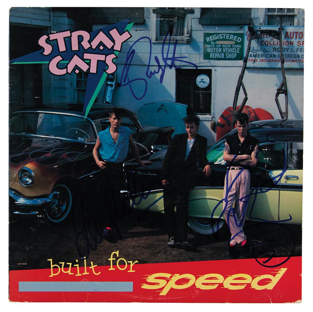 Built for Speed album signed on the front cover in blue felt tip by Brian Setzer, Slim Jim Phantom, and Lee Rocker. In fine condition. The record is not included.