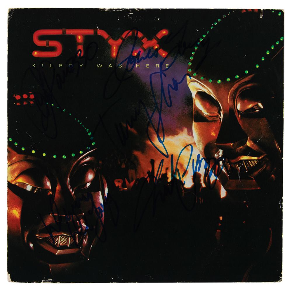 Kilroy Was Here album signed on the front cover in blue felt tip by Dennis DeYoung, Chuck Panozzo, John Panozzo, James Young, and Tommy Shaw. In fine condition, with light edge wear and a few surface creases. The record is included.
