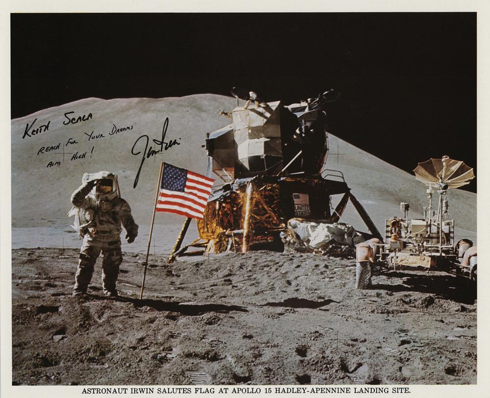 Official color 10 x 8 NASA lithograph of Apollo 15 CDR Jim Irwin saluting the American flag on the lunar surface, signed and inscribed in black felt tip, "Keith Scala, Jim Irwin," with a pre-printed sentiment in between. In fine condition.
