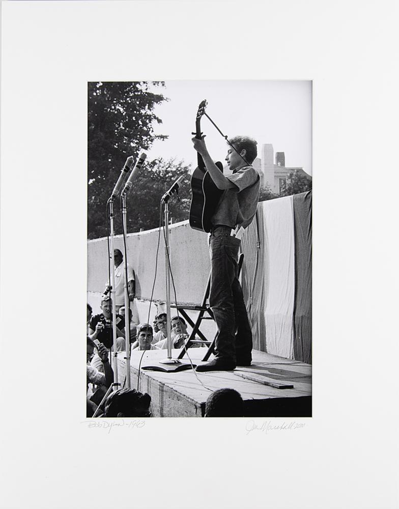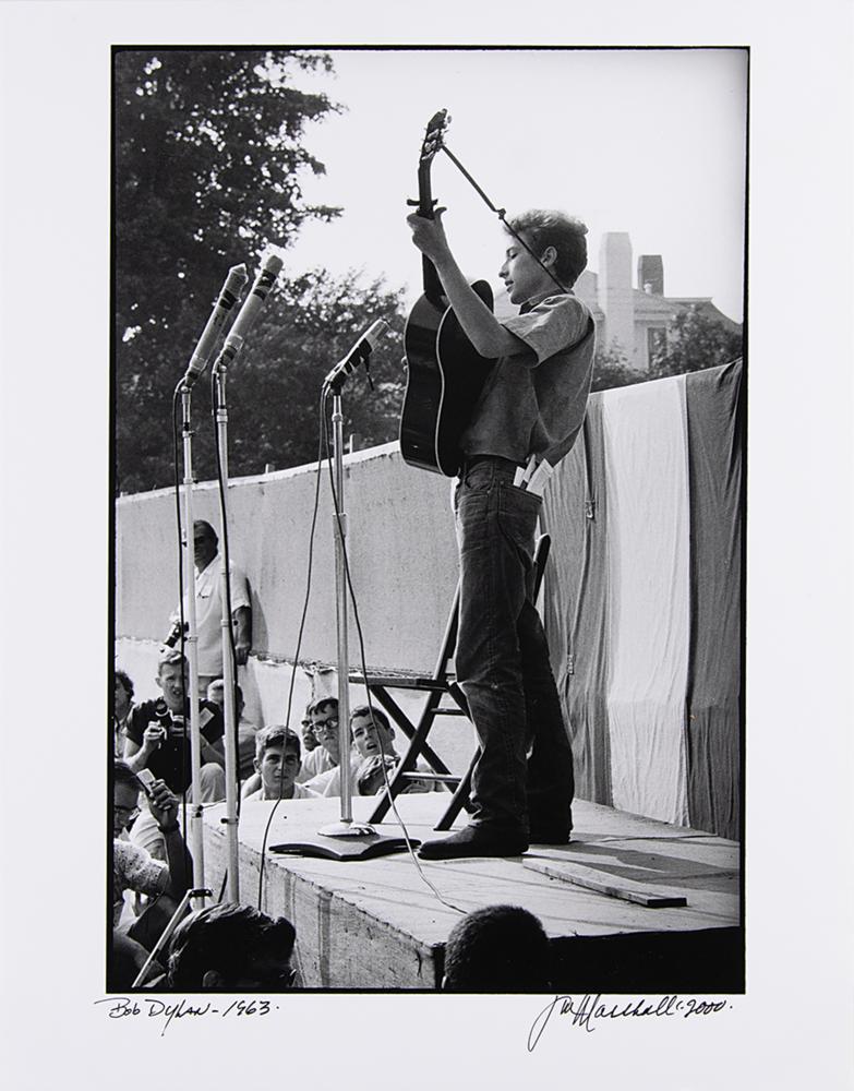 Very attractive semi-glossy 11 x 14 silver gelatin photographic print of Bob Dylan by photographer Jim Marshall, depicting the young troubadour with his acoustic guitar performing on a small outdoor stage in 1963 New York, signed and titled in the lower border in black felt tip, “Bob Dylan-1963, Jim Marshall-2000.” The print is matted to an overall size of 14 x 18, with the lower border of the mat signed in pencil in the same manner by Marshall. In fine condition.