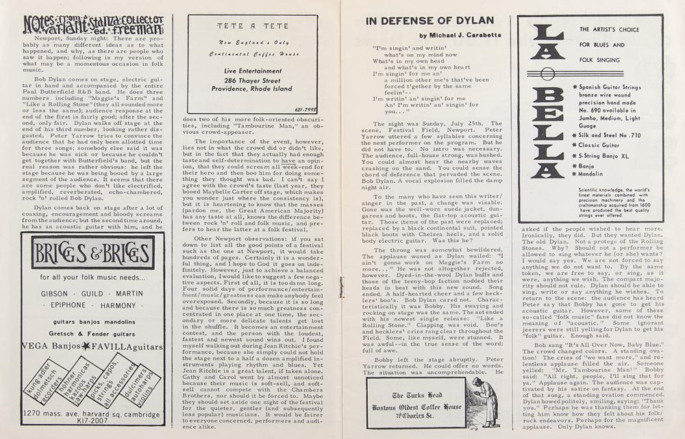 - an original issue of The Broadside from August 18, 1965, a bi-weekly Cambridge-based folk music periodical, containing contemporary assessments of Dylan's Newport performance.