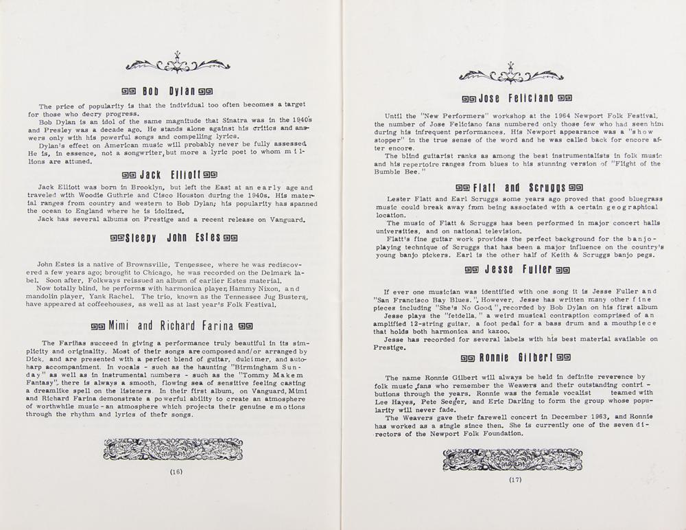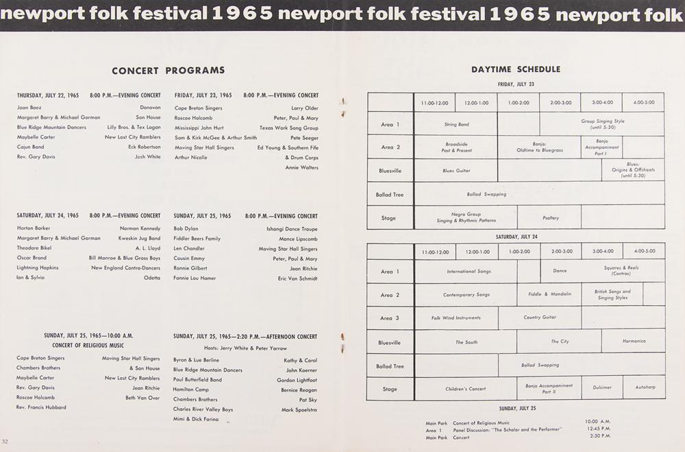 - an original program for the 1965 Newport Folk Festival, 8.5 x 11, 64 pages, featuring Dylan's column "Off the Top of My Head."