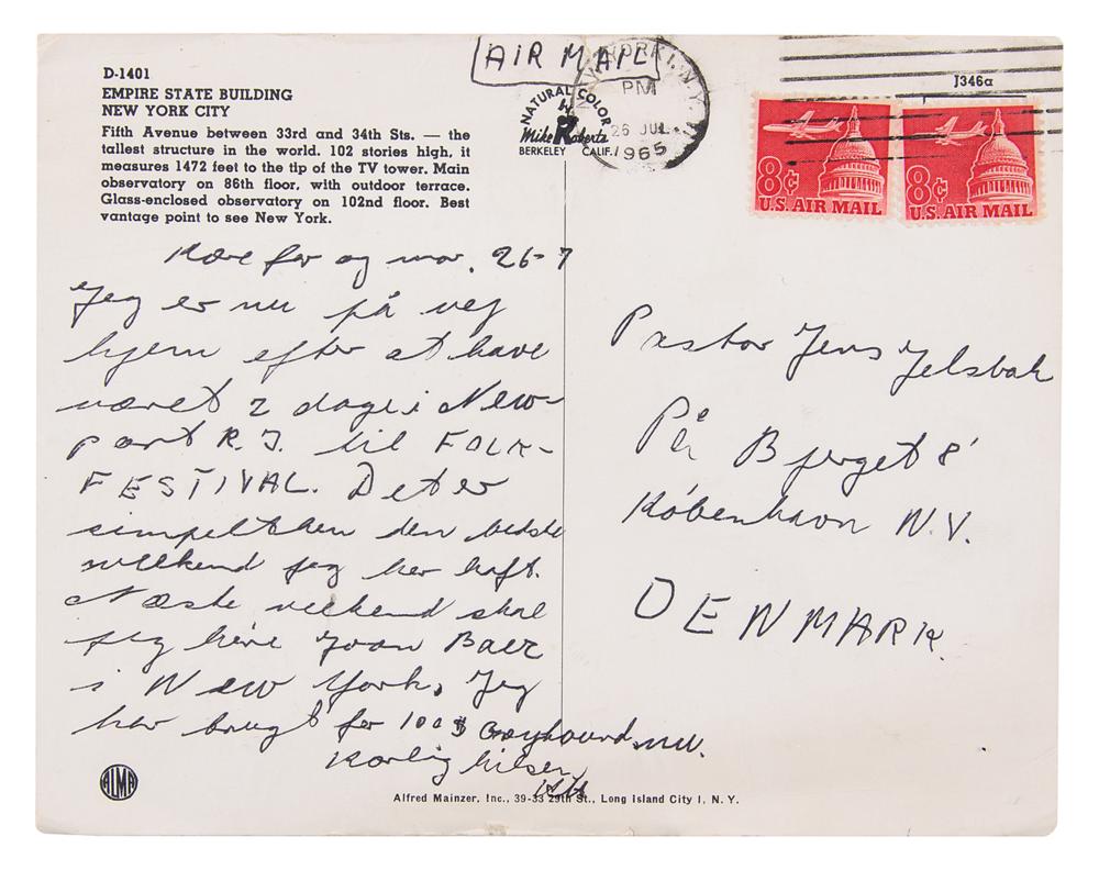 - an original postcard featuring the Empire State Building, postmarked at New York on July 26, 1966, sent home to Denmark by the Newport attendee. In full (translated): "Dear father and mother, I am now on my way home after been 2 days at in Newport to a Folk-Festival. It's the best weekend I have had. Next weekend I will hear Joan Baez in New York. I need $100 for the Greyhound now."