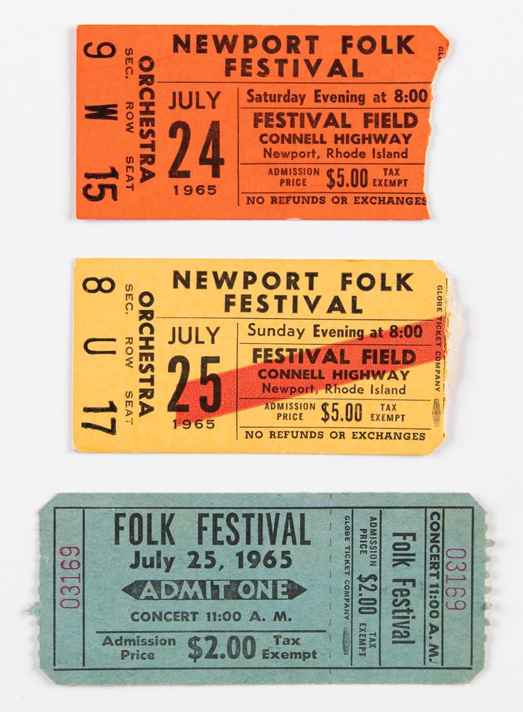 - an original orange ticket stub (Orchestra, Section 9, Row W, Seat 15) for admission to the Newport Folk Festival on July 24, 1965, the day of Dylan's three-song acoustic workshop set: 'All I Really Want to Do,' 'If You Gotta Go, Go Now,' and 'Love Minus Zero/No Limit.'