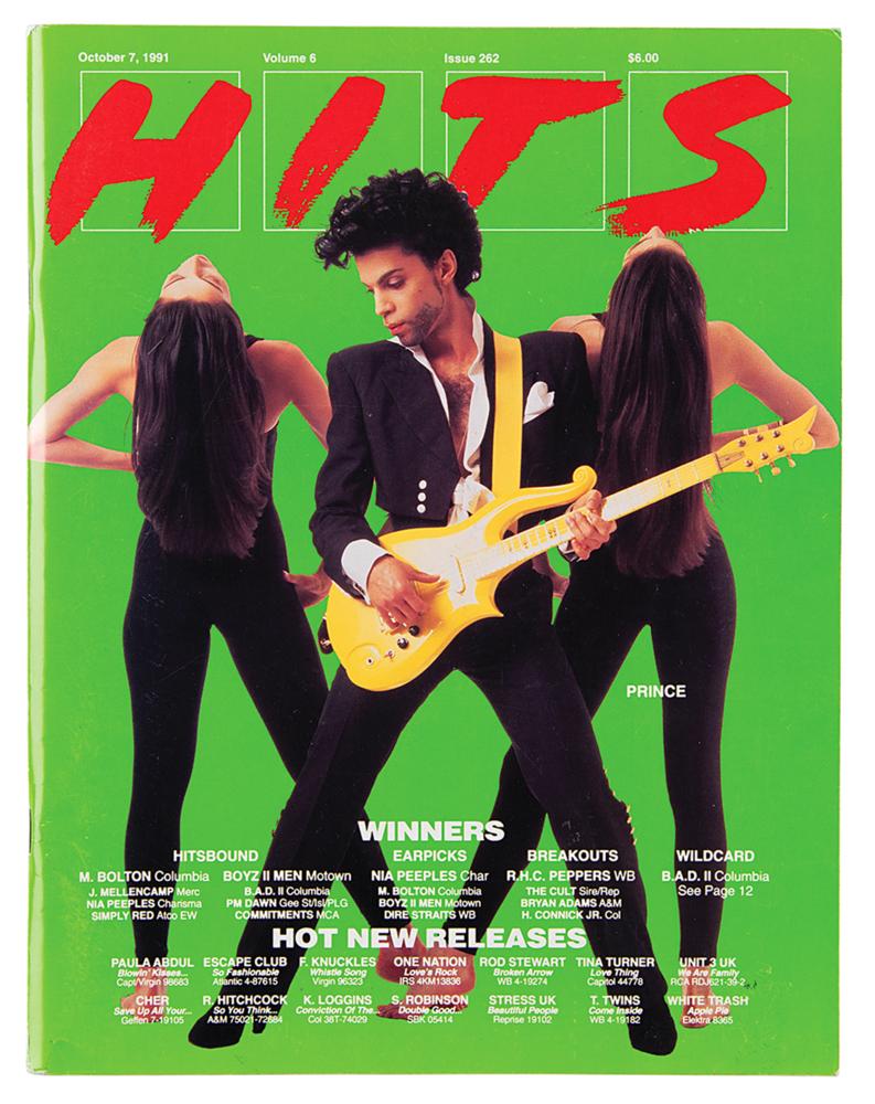 Prince's personal copy of the sought-after issue of HITS magazine from October 7, 1991, 90 pages, 8.5 x 11, with front cover showing Prince playing his yellow cloud guitar, with dancers Lori Werner ('Diamond') and Robia LaMorte ('Pearl') in the background. In fine condition. From the collection of Prince's assistant Therese Stoulil and accompanied by a letter of provenance.