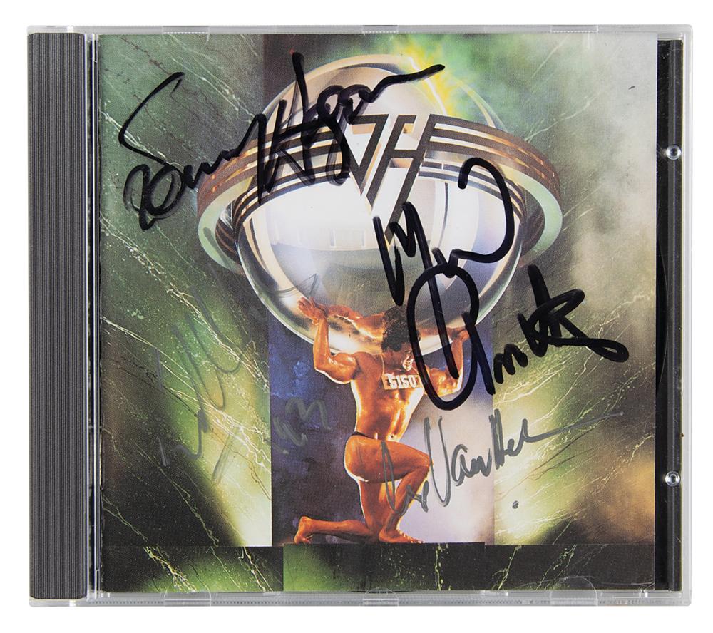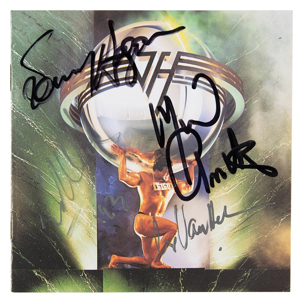 5150 CD by Van Halen, signed on the front cover in silver ink by Eddie Van Halen, who adds "'93," and Alan Van Halen, and in black felt tip by Sammy Hagar and Michael Anthony. The consignor notes that the autographs were obtained by a person who worked for various record companies in the 1980s and 1990s and who gained access to groups at numerous concerts. In fine condition. The CD is included. Accompanied by a certificate of authenticity from Tracks.