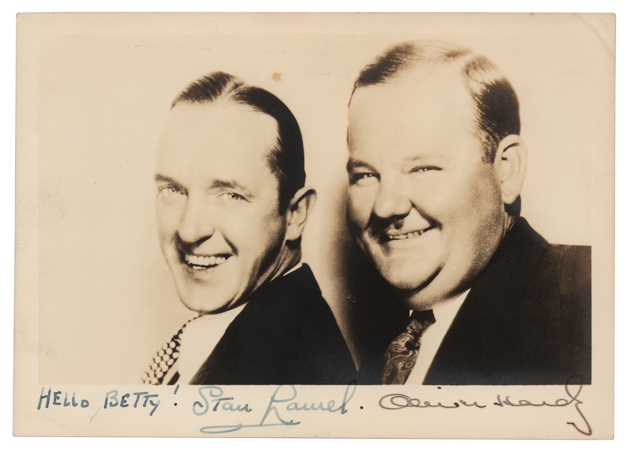 Classic vintage matte-finish 7 x 5 photo of famed comedy duo Laurel and Hardy side-by-side, signed and inscribed in the lower border in fountain pen, "To Betty! Stan Laurel" and "Oliver Hardy.” In very good to fine condition, with slight fading, a small crease to the upper right corner tip, and light silvering to the darker areas of the image.