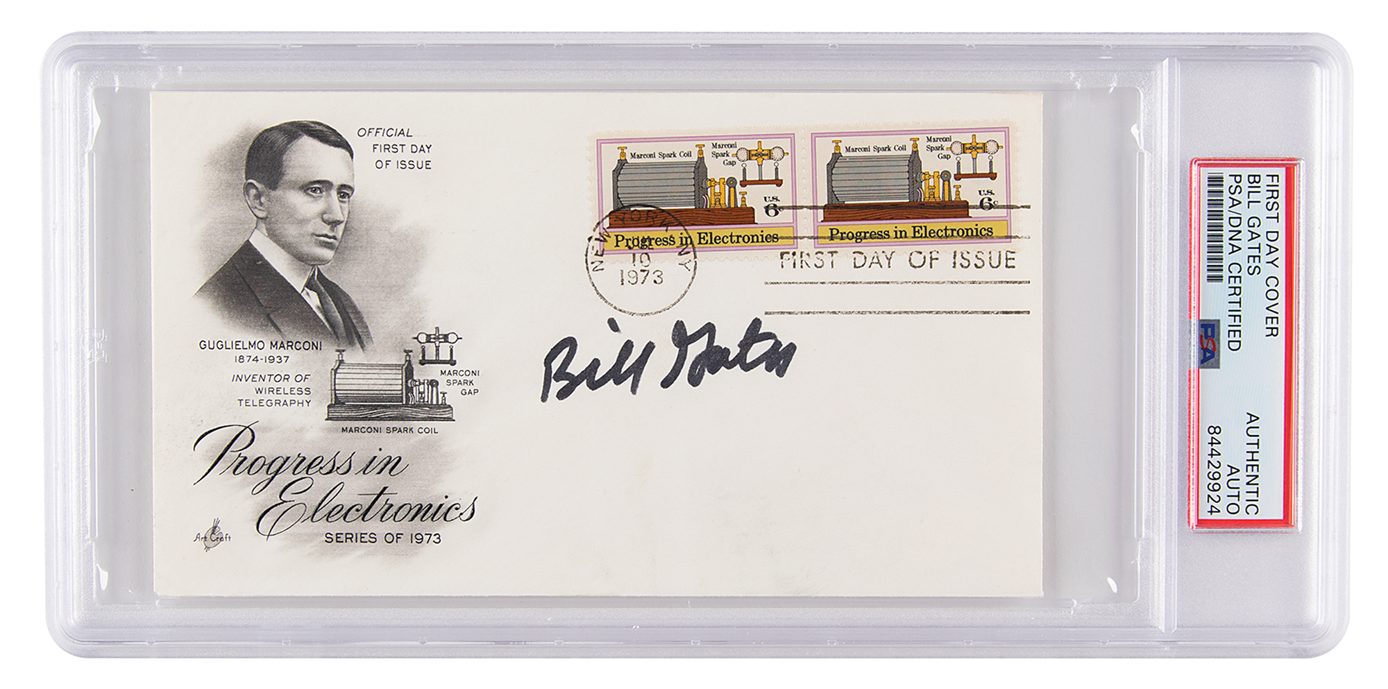 FDC with a cachet honoring Guglielmo Marconi and 'Progress in Electronics,' boldly signed in black felt tip, "Bill Gates." In very fine condition. Encapsulated in a PSA/DNA authentication holder.