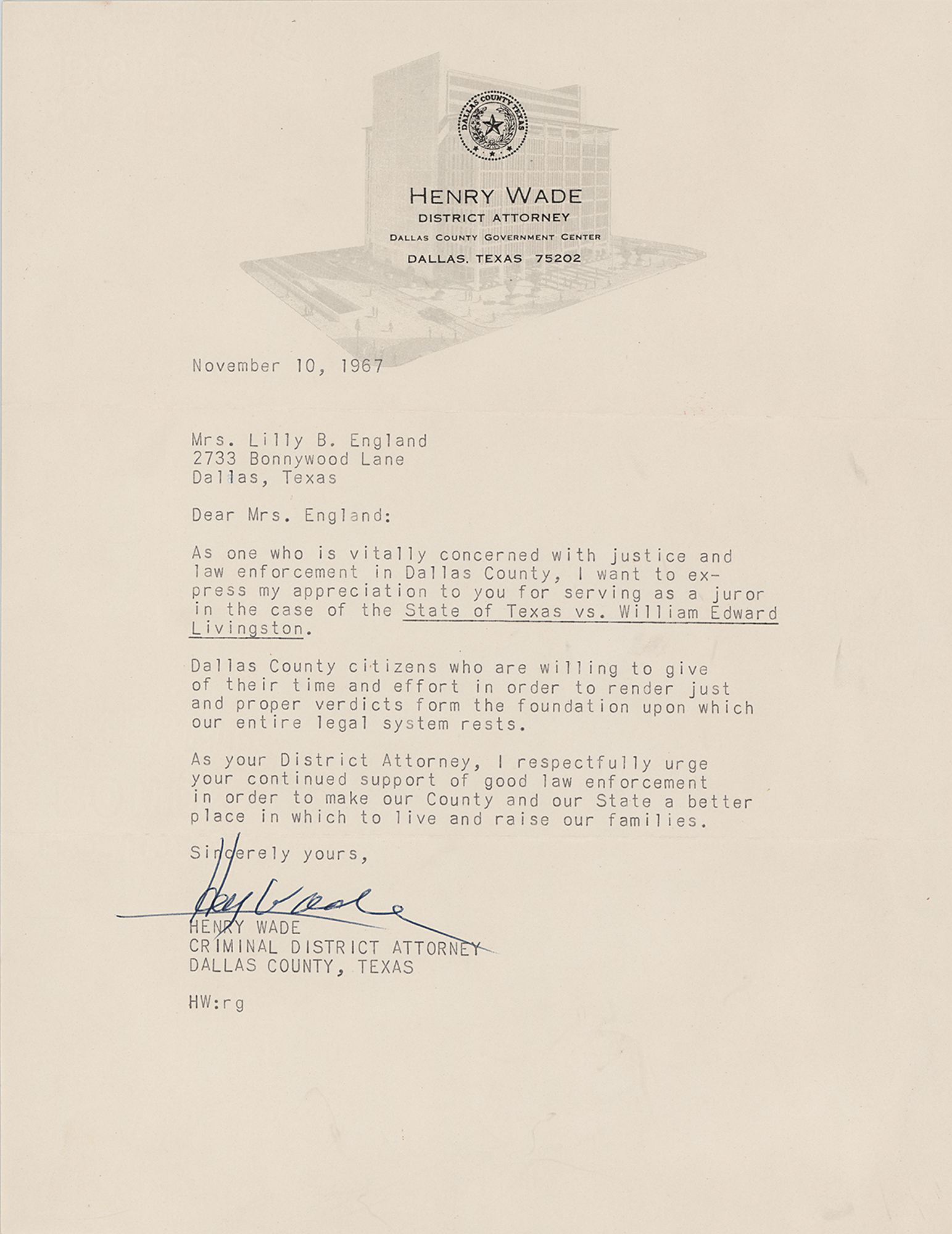 American lawyer (1914-2001) who served as district attorney of Dallas County from 1951 to 1987, participating in two of the most famous court cases of the 20th century: the prosecution of Jack Ruby for killing Lee Harvey Oswald, and the U.S. Supreme Court's decision legalizing abortion, Roe v. Wade. TLS, one page, 8.5 x 11, personal letterhead, November 10, 1967. Letter to Lilly B. England of Dallas, in part: "As one who is vitally concerned with justice and law enforcement in Dallas County, I want to express my appreciation to you for serving as a juror in the case of the State of Texas vs. William Edward Livingston. Dallas County citizens who are willing to give of their time and effort in order to render just and proper verdicts form the foundation upon which our entire legal system rests." In fine condition. Accompanied by the original mailing envelope.