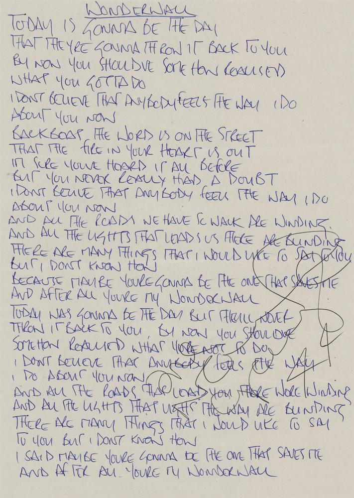 Handwritten lyrics by Noel Gallagher for "Wonderwall," one page, 8.25 x 11.75, signed at the conclusion in black ballpoint, "Love, Noel Gallagher, xx." Gallagher pens the lyrics to Oasis' most popular song, beginning: "Today is gonna be the day / that they're gonna throw it back to you / By now you should've some how realised / what you gotta do / I don't believe that anybody feels the way I do / about you now." The piece closes with the famous chorus: "I said maybe you're gonna be the one that saves me / And after all you're my wonderwall." In fine condition, with light overall creasing. A spectacular example of the band's most iconic song, written in full and signed by the songwriter.