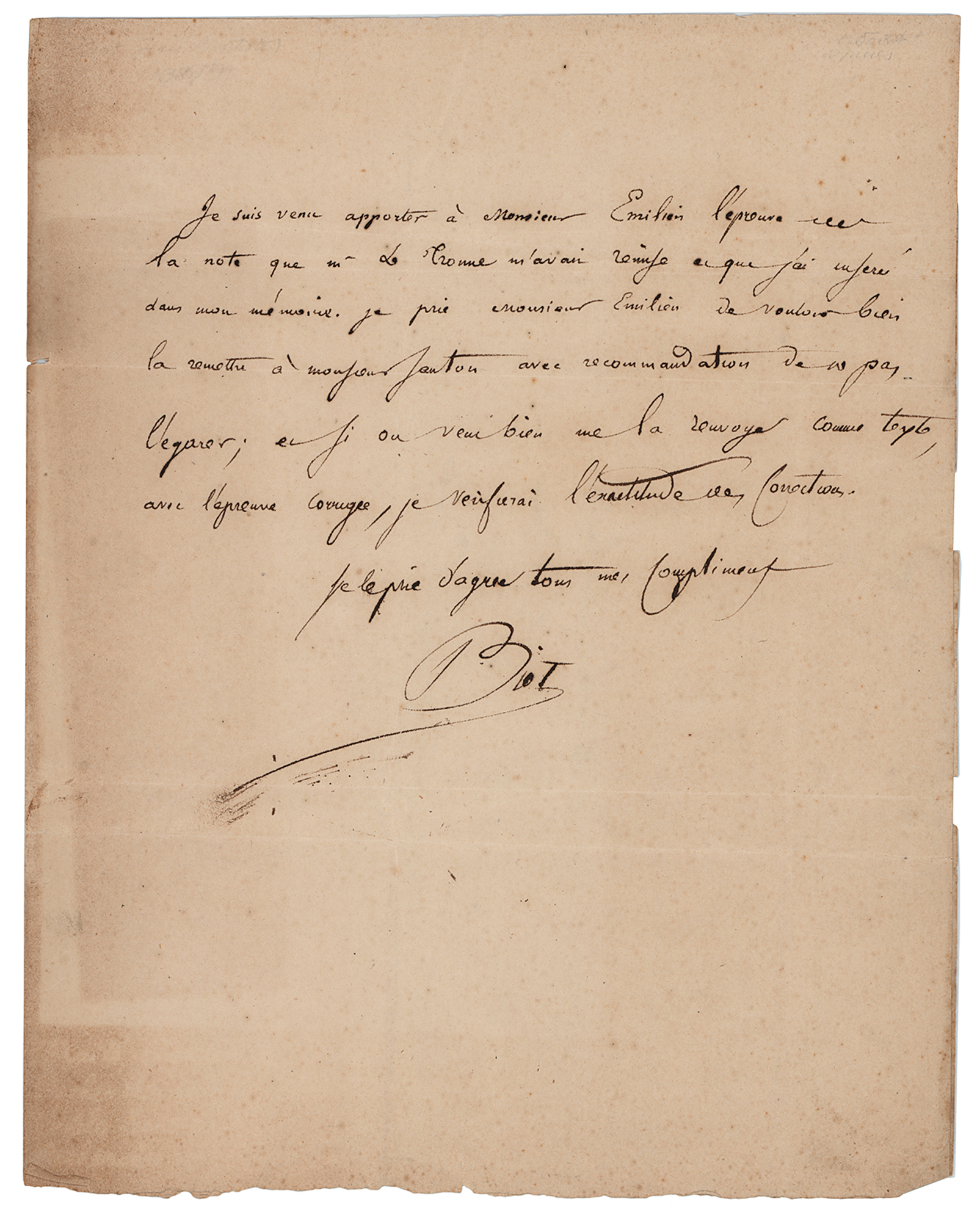 French physicist, astronomer, and mathematician (1774-1862) who established the reality of meteorites, made an early balloon flight, and studied the polarization of light. ALS in French, signed “Biot,” one page, 8.25 x 10.5, no date. Handwritten letter to "Monsieur Emilien, chez Mr. Didot, Paris," presumably an editor at the firm of Firmin Didot Frères, Fils et Compagnie, a leading French printing and publishing house. In part (translated): "I just brought the publisher's proof to Monsieur Emilien—the note that M. Le Crome returned to me [is one] that I have inserted into my memory. I pray Monsieur Emilien to kindly return it to Monsieur Santon with the recommendation not to lose it; and if anyone wants to return it to me as text, along with the corrected publisher's proof, I will verify the accuracy of the corrections." Addressed on the integral leaf in Biot's hand. In very good to fine condition, with light irregular toning, edge wear, and edge tears to the integral address leaf. Accompanied by a full letter of authenticity from PSA/DNA.