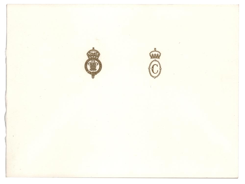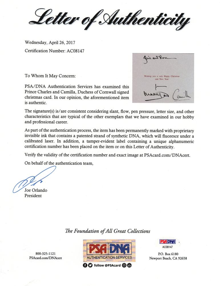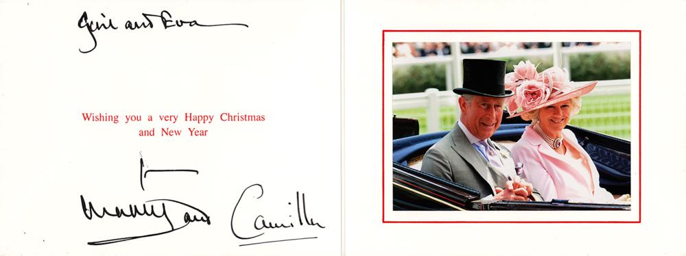 Desirable royal Christmas card, measuring 16 x 6 open, featuring an affixed color photo of Charles and Camilla seated in the back of a coach, signed and inscribed in black ink, “Cyril and Eva, from Charles and" and "Camilla.” In very fine condition. Accompanied by a full letter of authenticity from PSA/DNA.