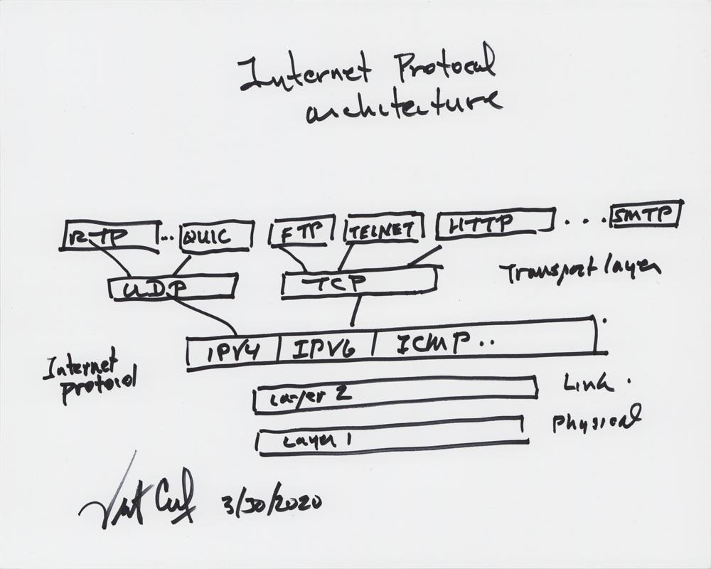 American Internet pioneer (born 1943) and one of 'the fathers of the Internet,' who developed TCP/IP technology and the first commercial email system. Original felt tip sketch of a diagram of the "Internet Protocol Architecture," showing the levels of transportation protocols, internet protocols, and physical layers, accomplished by Cerf on a white 10 x 8 cardstock sheet, signed in the lower left, "Vint Cerf." In very fine condition.