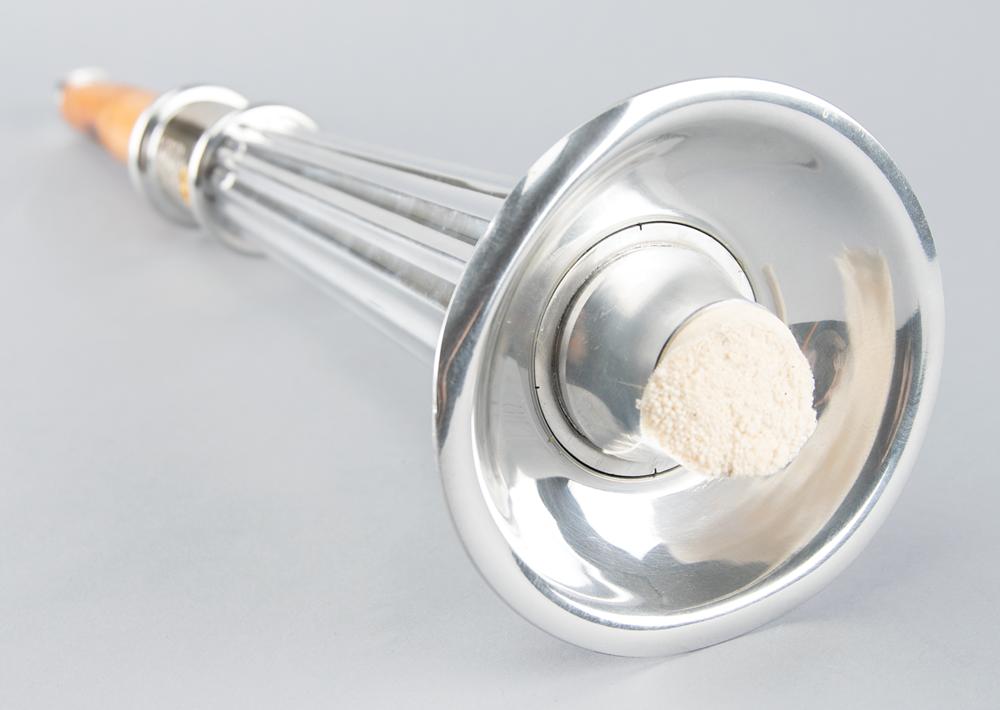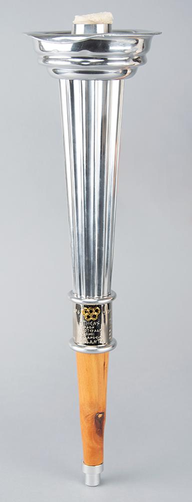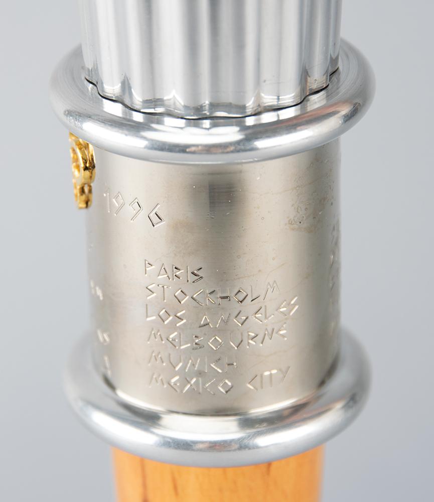 Uncommon official International Olympic Committee (IOC) centennial torch, constructed of aluminum and wood, measuring 21.75″ in length and 6″ at its widest point. The main body is ribbed in a fashion similar to the twenty-two reeds found on the Atlanta torch, with a band above the wooden handle engraved with the names of all the host cities and their dates since 1896. The bottom ring is loose from the engraved band, the applied Olympic ring emblem remains attached by just one stud, and the rim of the torch's bowl is dented.