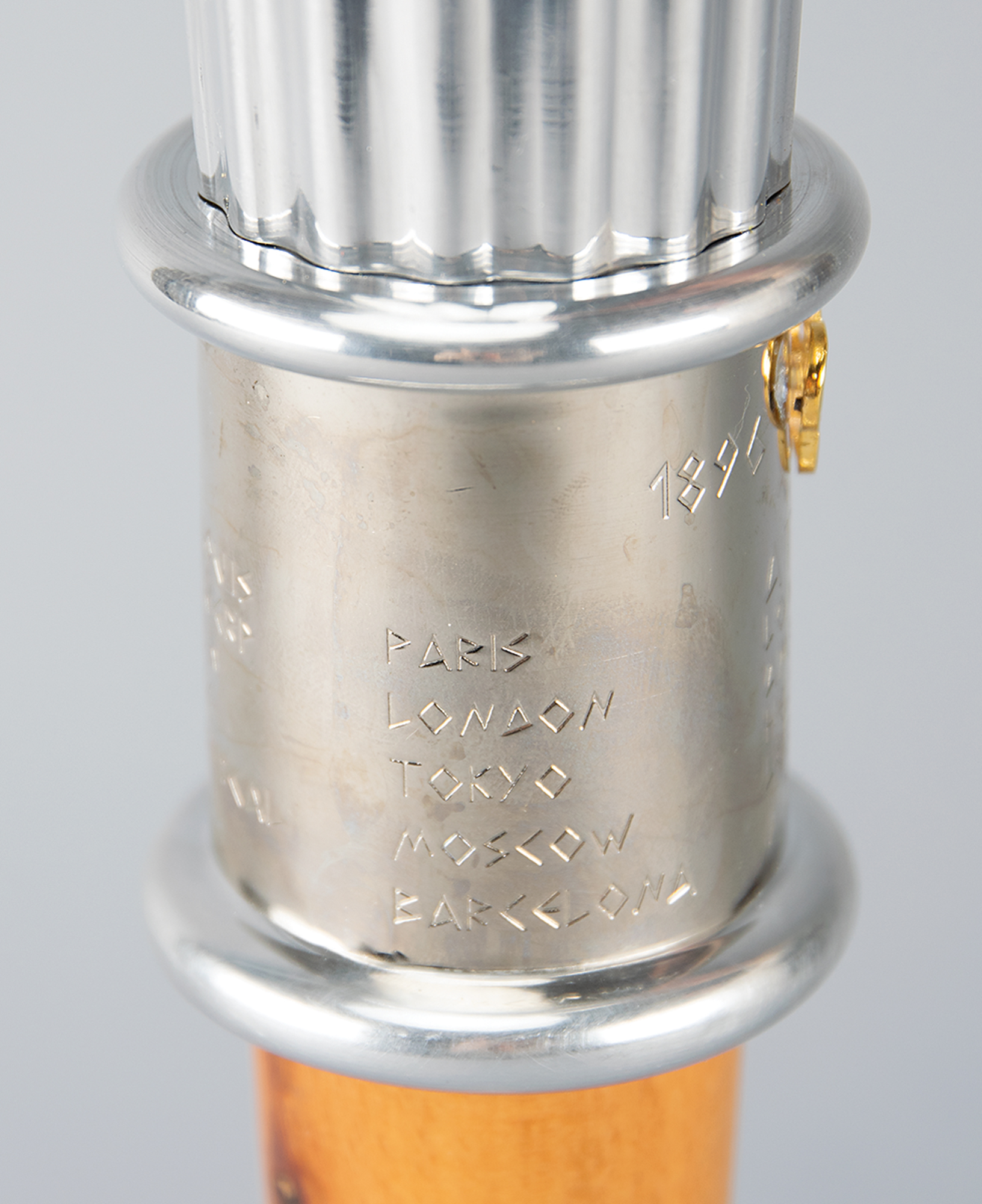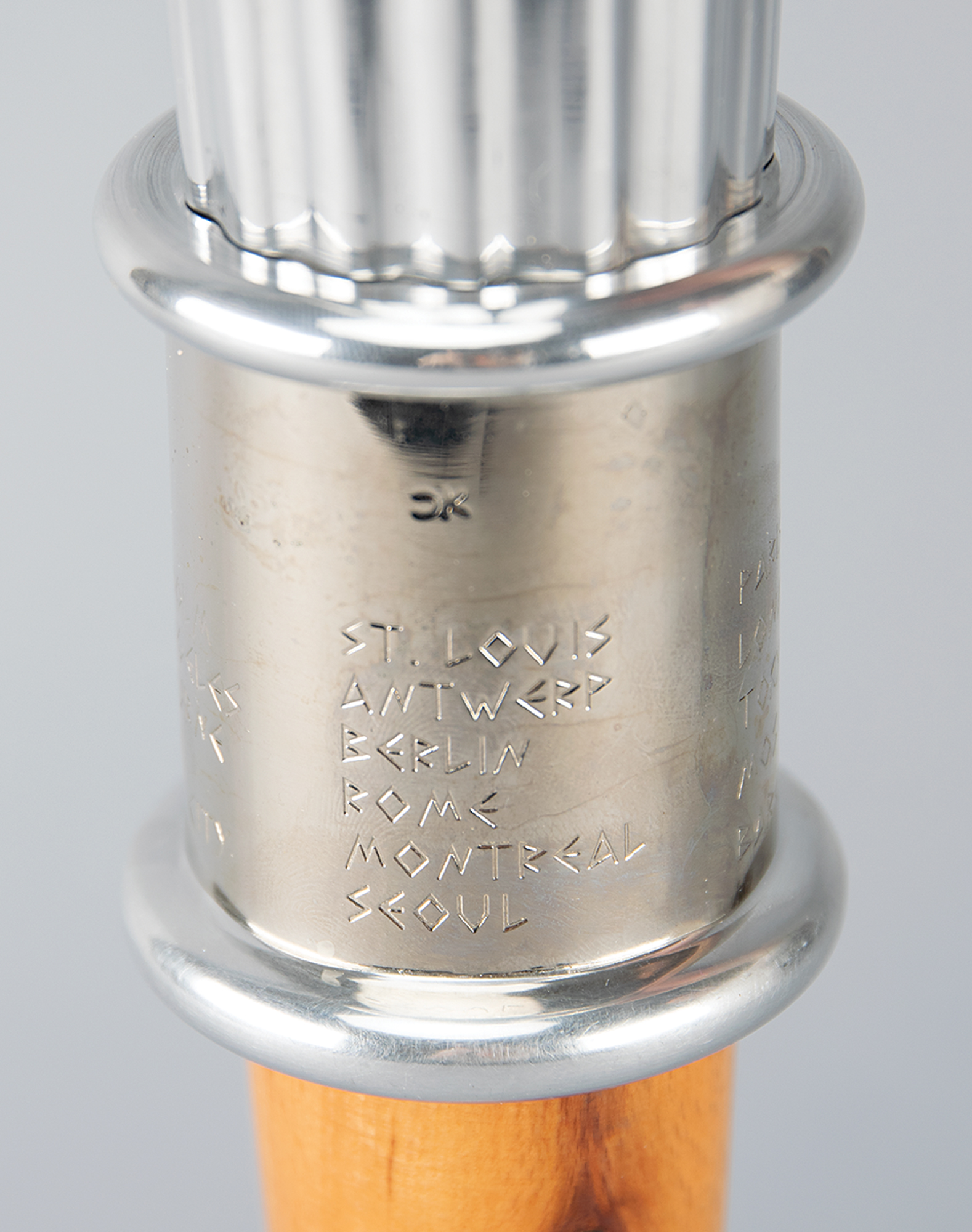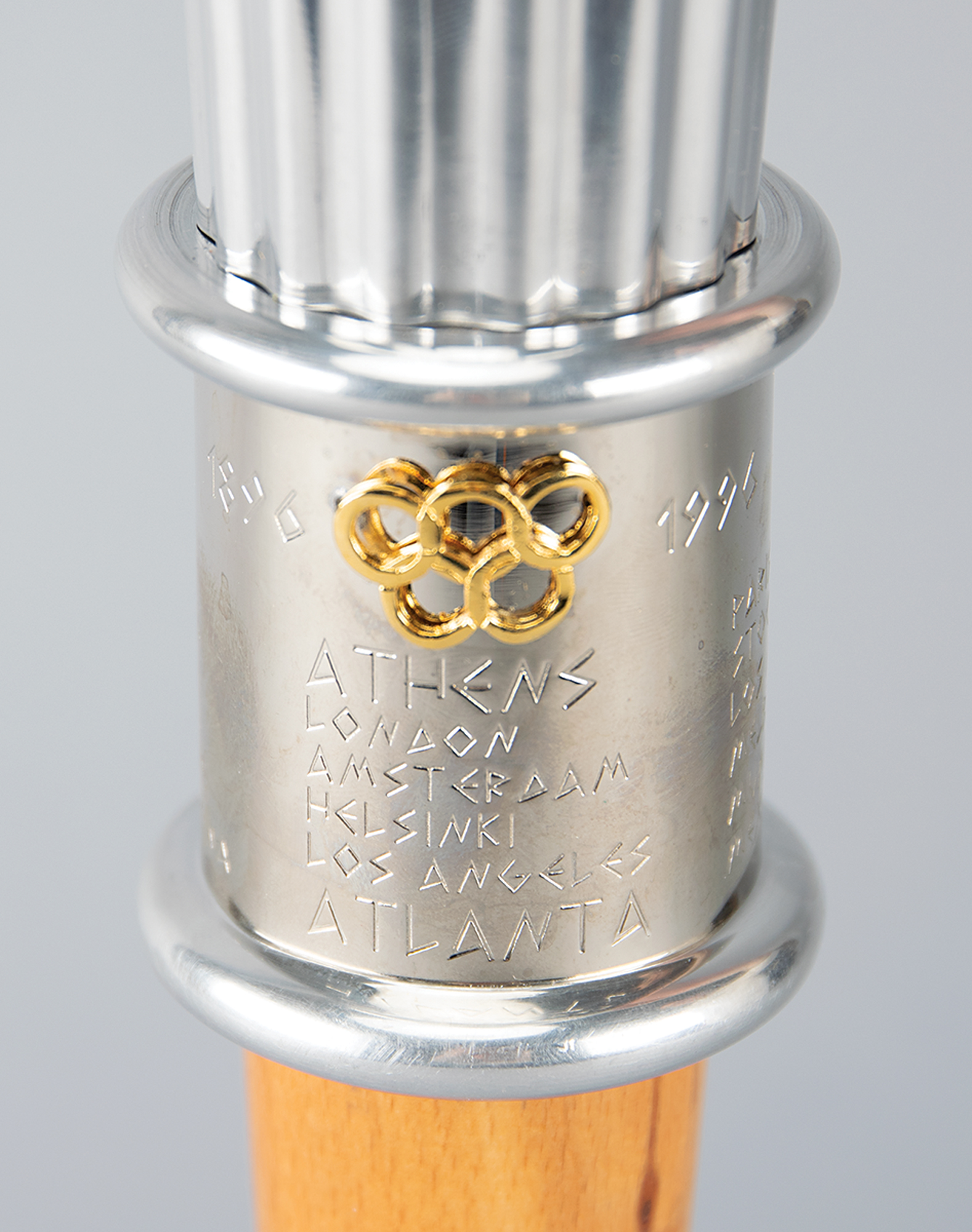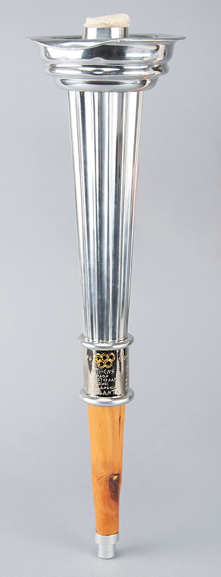 Uncommon official International Olympic Committee (IOC) centennial torch, constructed of aluminum and wood, measuring 21.75″ in length and 6″ at its widest point. The main body is ribbed in a fashion similar to the twenty-two reeds found on the Atlanta torch, with a band above the wooden handle engraved with the names of all the host cities and their dates since 1896. The bottom ring is loose from the engraved band, the applied Olympic ring emblem remains attached by just one stud, and the rim of the torch's bowl is dented.