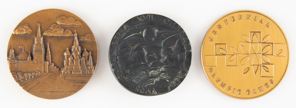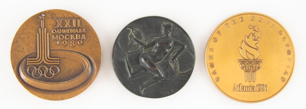 Nice collection of three participation medals from Summer Olympic Games, representing three different eras of international competition. Includes: Rome 1960 Summer Olympics Bronze Participation Medal; Moscow 1980 Summer Olympics Tombac Participation Medal; and Atlanta 1996 Summer Olympics Bronze Participation Medal with Box and Pouch).