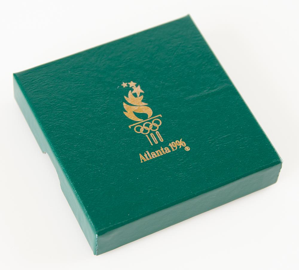 Participation medal issued for the 1996 Atlanta Summer Olympics. Bronze, 60 mm, 60 gm, by Malcolm Grear Designers. The front features the Atlanta Games emblem under raised text, "Games of the XXVI Olympiad"; the reverse bears a quilt of leaves and the raised text, "Centennial Olympic Games." Includes its original velvet pouch and green box.
