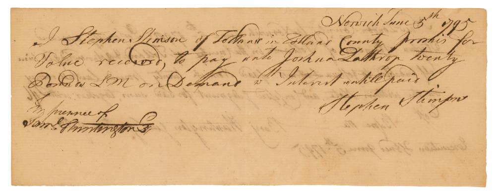 Signer of the Declaration of Independence from Connecticut (1731-1796) and seventh president of the Continental Congress. Manuscript DS, signed “Sam'l Huntington,” one page, 7.75 x 2.75, June 5, 1795. State of Connecticut promissory note, which reads: "I Stephen Stimson?promise for Value received, to pay Joshua Lathrop twenty pounds?on Demand w/ Interest until paid." Signed in the lower left by Samuel Huntington. In fine condition.